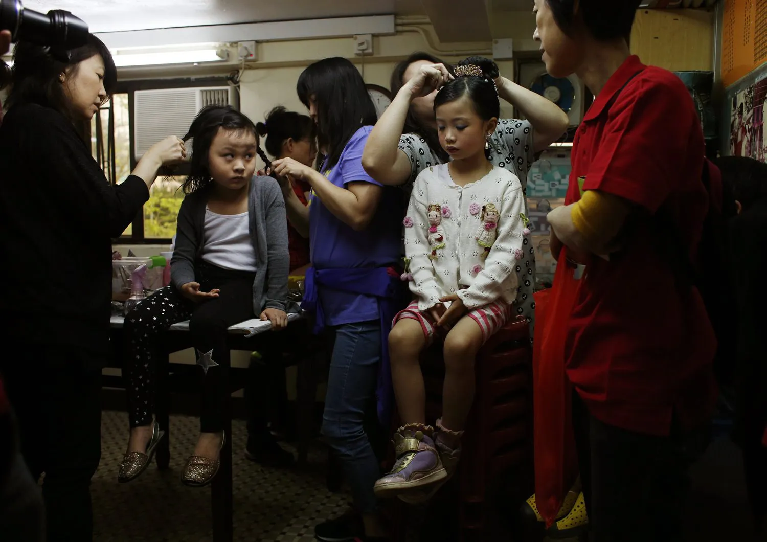 Nicole Kwok (R), 6, receives hair dressing as Tammy Lau, 5, looks on before they took part in a Bun Festival parade at Hong Kong's Cheung Chau island May 6, 2014. The festival celebrates the islanders' deliverance from famine many centuries ago and is meant to placate ghosts and restless spirits. (Photo by Bobby Yip/Reuters)