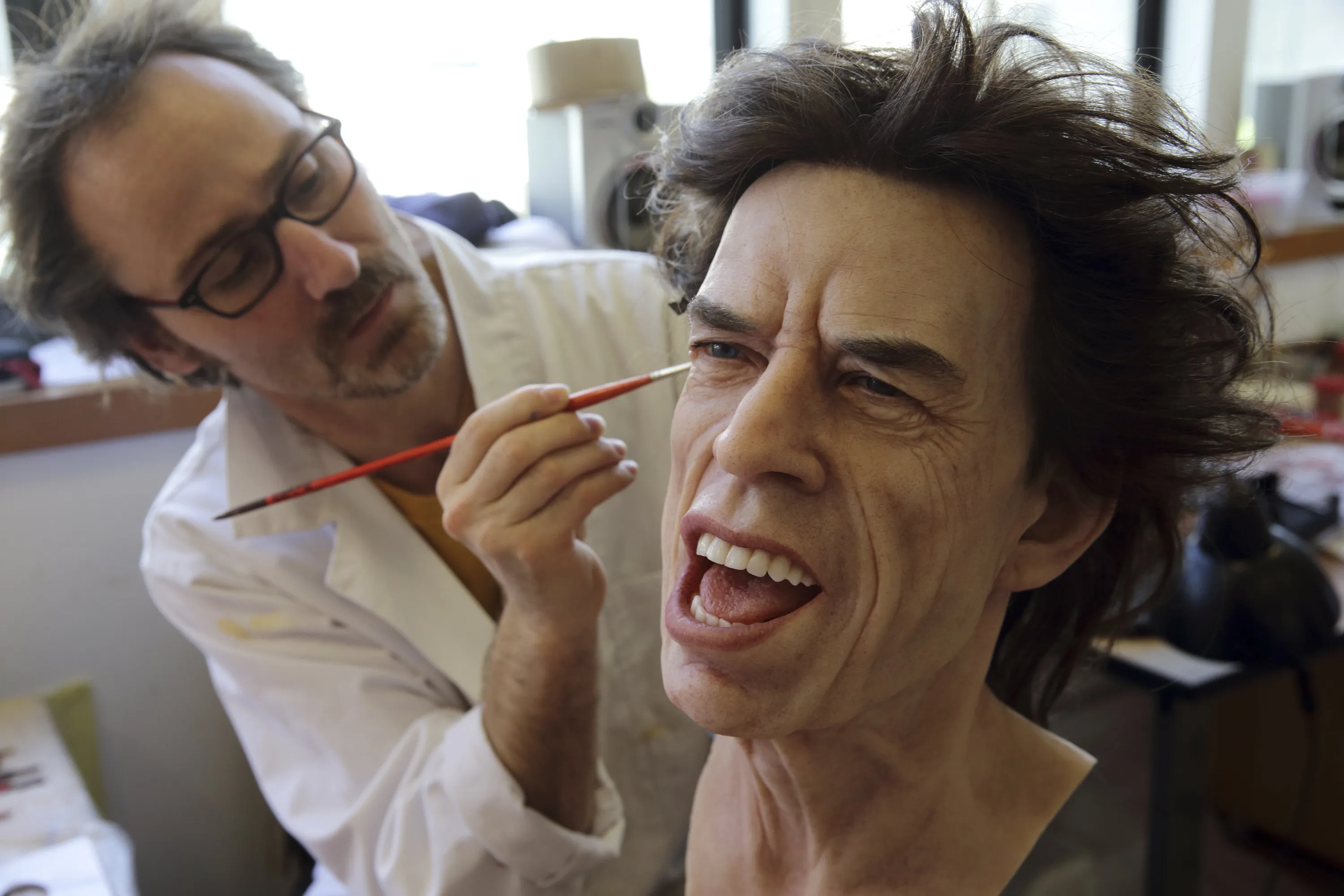 Paris' Grevin Wax Museum painter Franck Bruneau works on the head of Rolling Stones lead singer Mick Jagger at their workshop in Paris, April 9, 2014. The statue is prepared ahead of the opening of the new Grevin Wax Museum in Prague on May 1st. Fifteen artists, including sculptors, moulders, dressmakers, make-up artists, wig makers, hairdressers along with lighting and set designers and sound engineers are involved in the creation of the hyper realistic statues. The Grevin Museum opened in Paris in 1882. (Photo by Philippe Wojazer/Reuters)