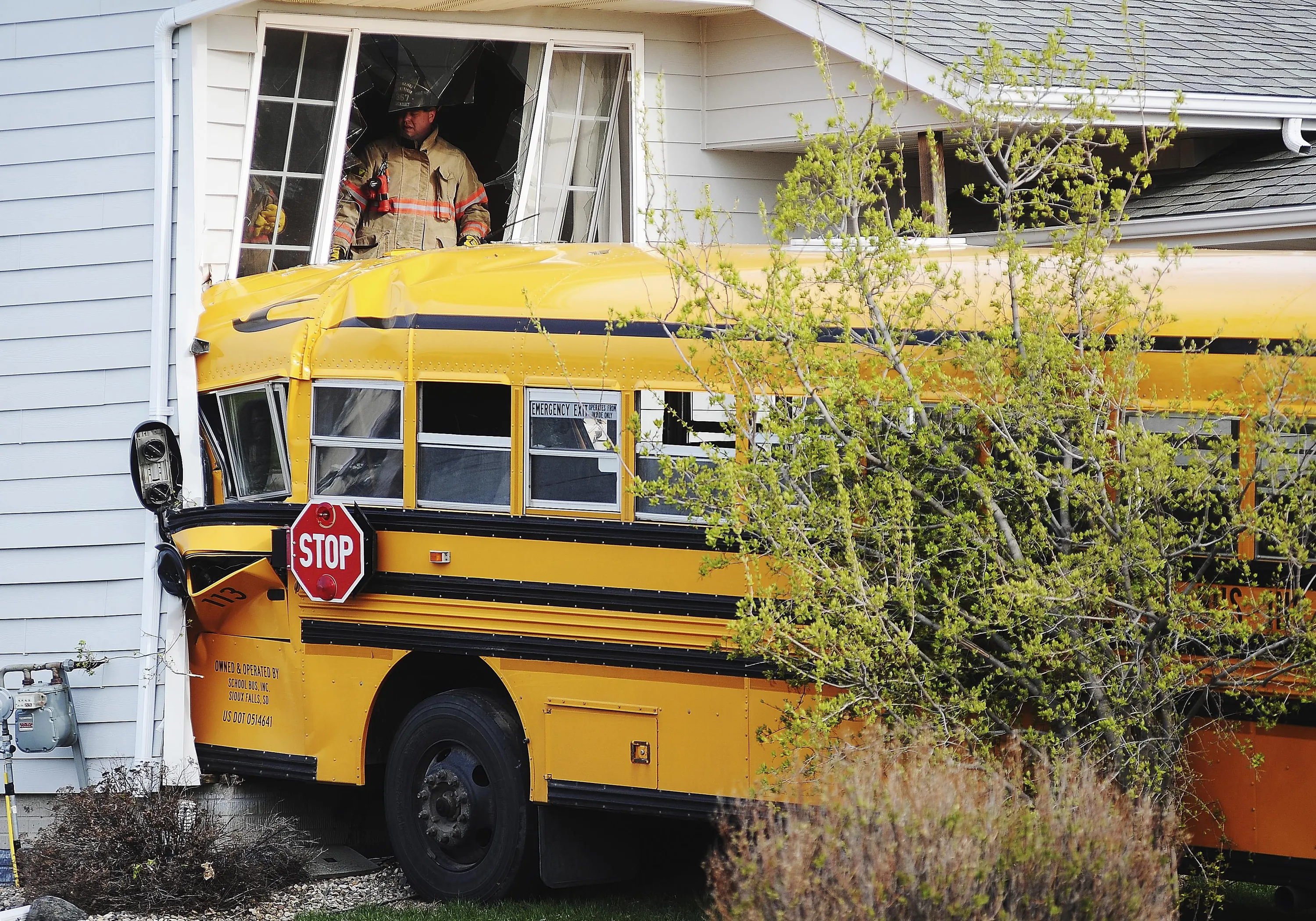 Rescue personnel work a site where a bus crashed into a house, Tuesday, May 6, 2014, in Sioux Falls, S.D. Police say the bus hit one house, then crossed the street and crashed into another house. There were no children on the bus at the time of the crash, and the bus driver, 66, was taken to the hospital with a head injury. (Photo by Joe Ahlquist/AP Photo/Argus Leader)