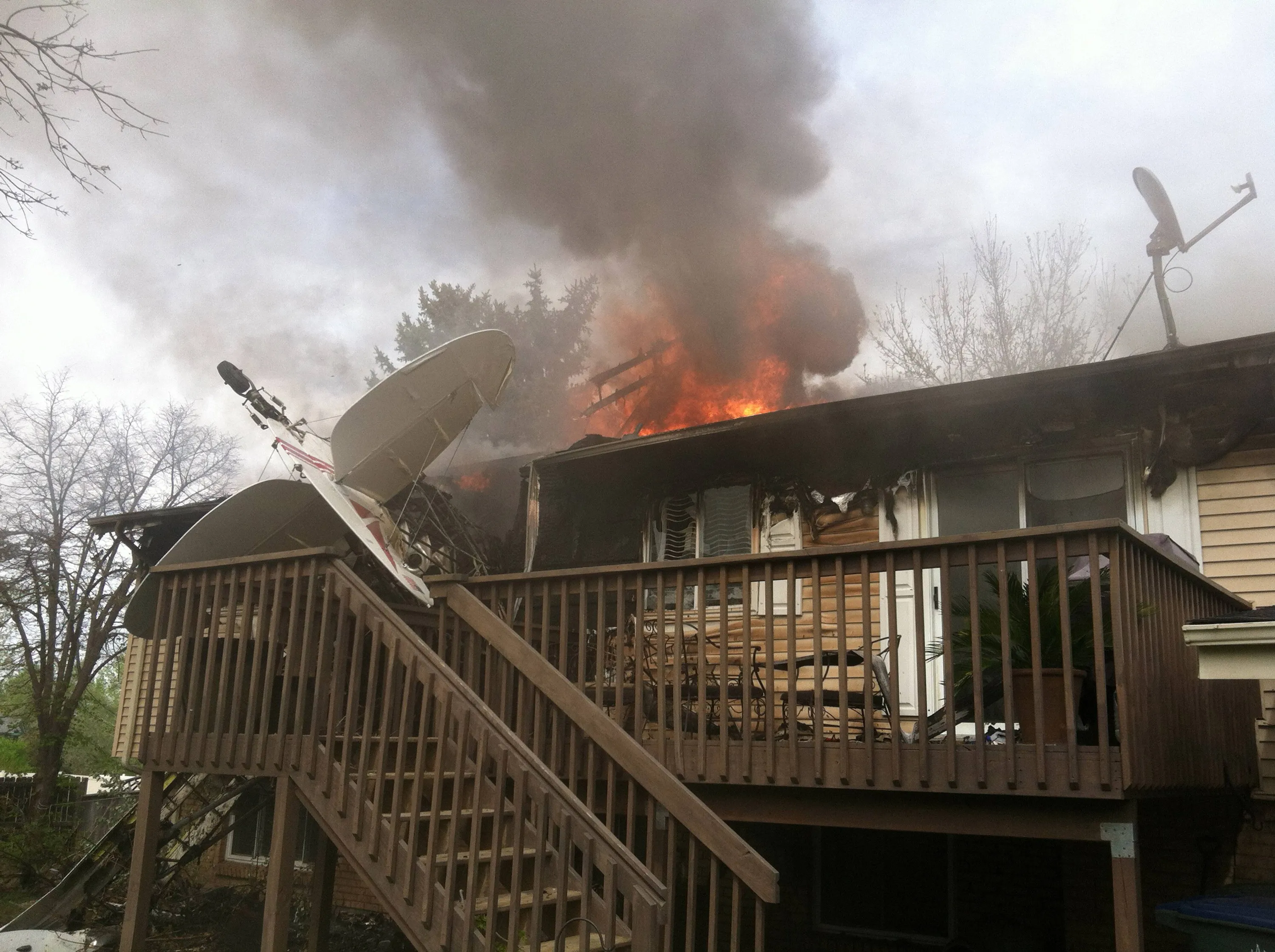 In this photo provided by North Metro Fire Rescue District, a house is on fire after a plane crashes into it, on Monday, May 5, 2014, in Northglenn, Colo. The pilot, Brian Veatch, said that he once owned the home, as indicated by property records, but said he didn't realize that's where he crashed until someone else pointed it out. Veatch tried to put out the fire with a garden hose before he was forced away by burning fuel. (Photo by AP Photo/North Metro Fire Rescue District)