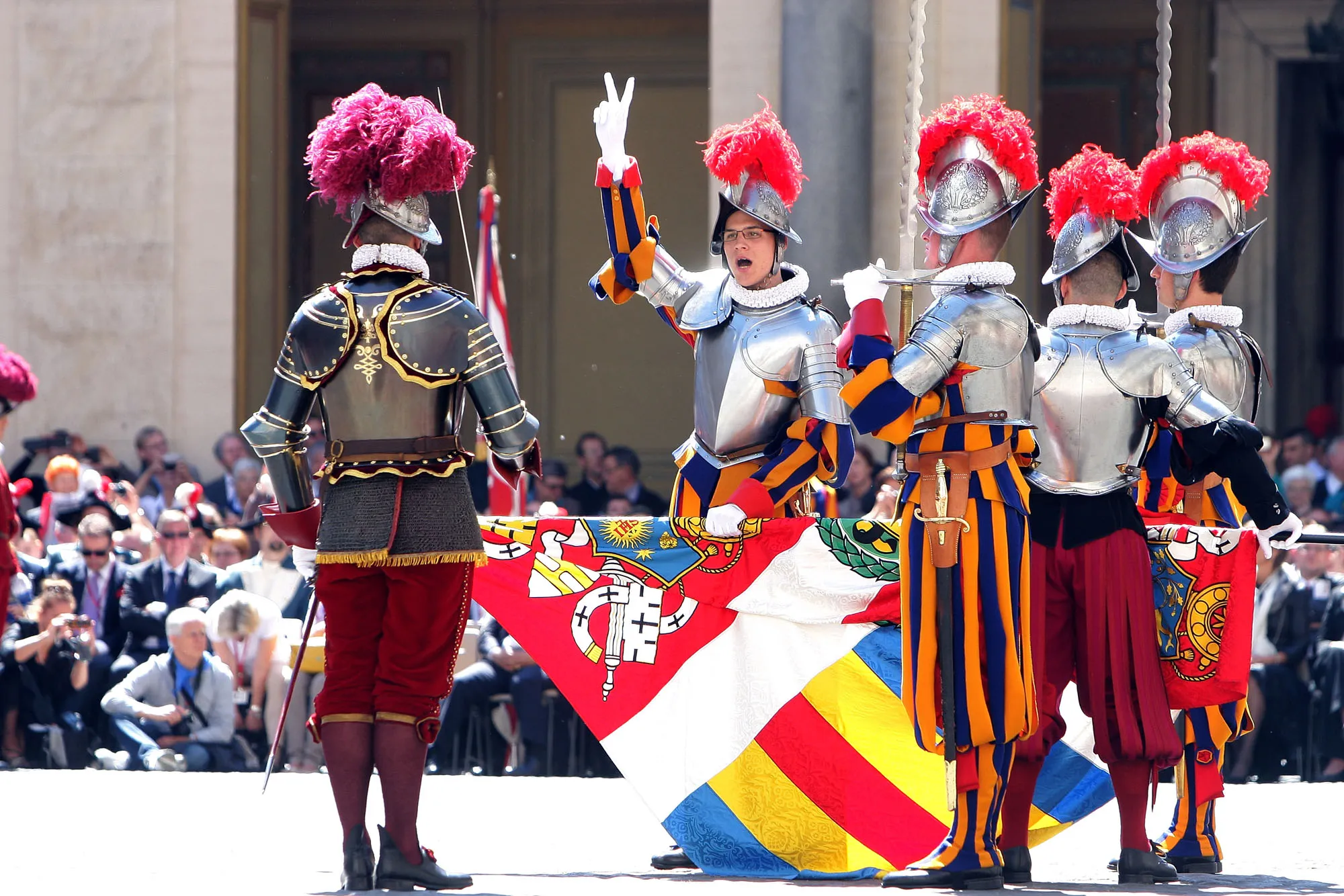 A new recruit raises three fingers in the sign of the trinity at a swearing in ceremony for the Vatican's elite Swiss Guard at the Cortile di San Damaso at The Vatican on May 6, 2014 in Vatican City, Vatican. The swearing in ceremony is held on May 6 every year to commemorate the 147 halberdiers who died defending the pope in 1527. (Photo by Franco Origlia/Getty Images)