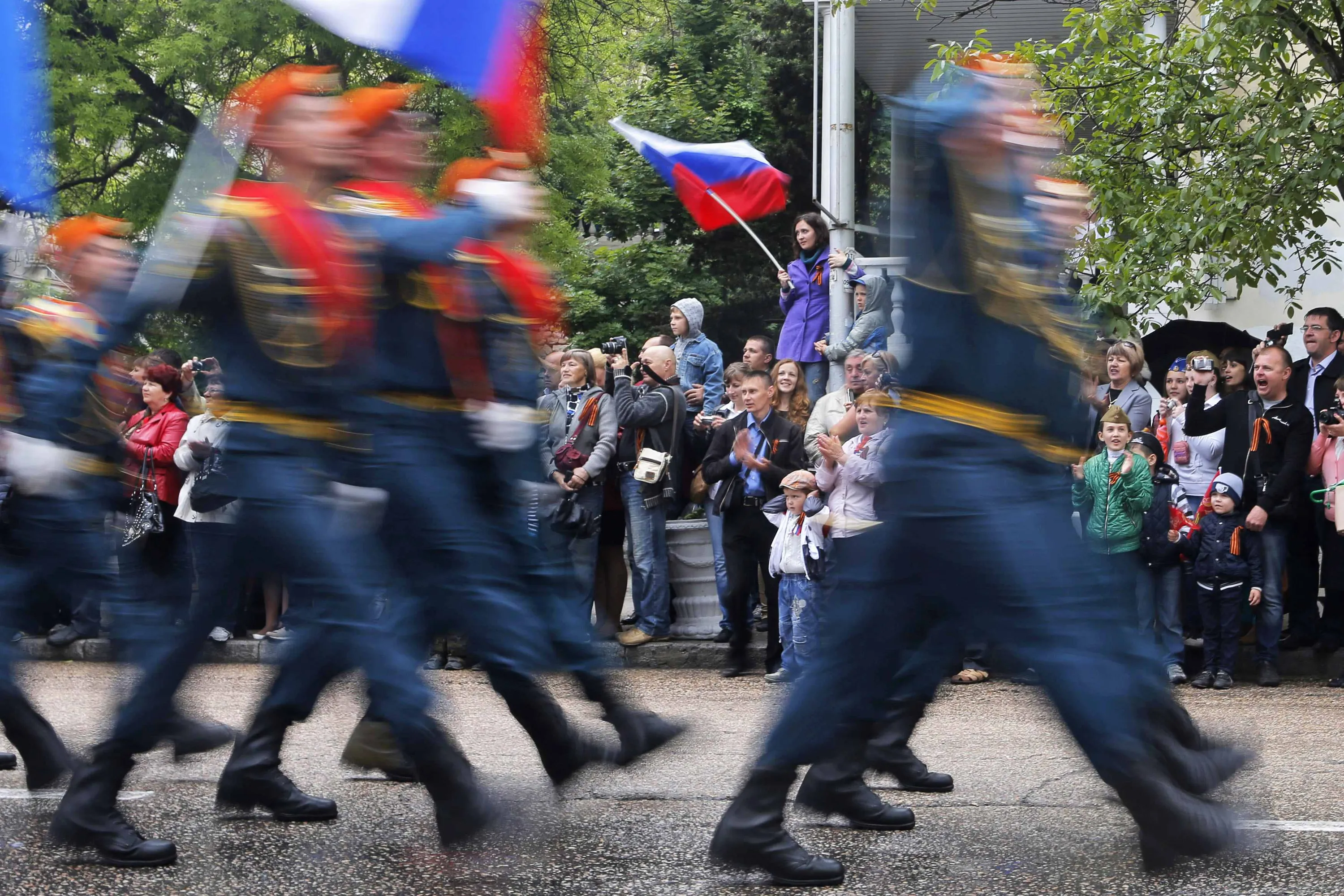 Russian servicemen march during celebrations to mark Victory Day in the Crimean port of Sevastopol May 9, 2014. Russian President Vladimir Putin praised the Soviet role in defeating fascism on Friday, the anniversary of the World War Two victory over Nazi Germany, and said those who defeated fascism must never be betrayed. (Photo by Maxim Shemetov/Reuters)