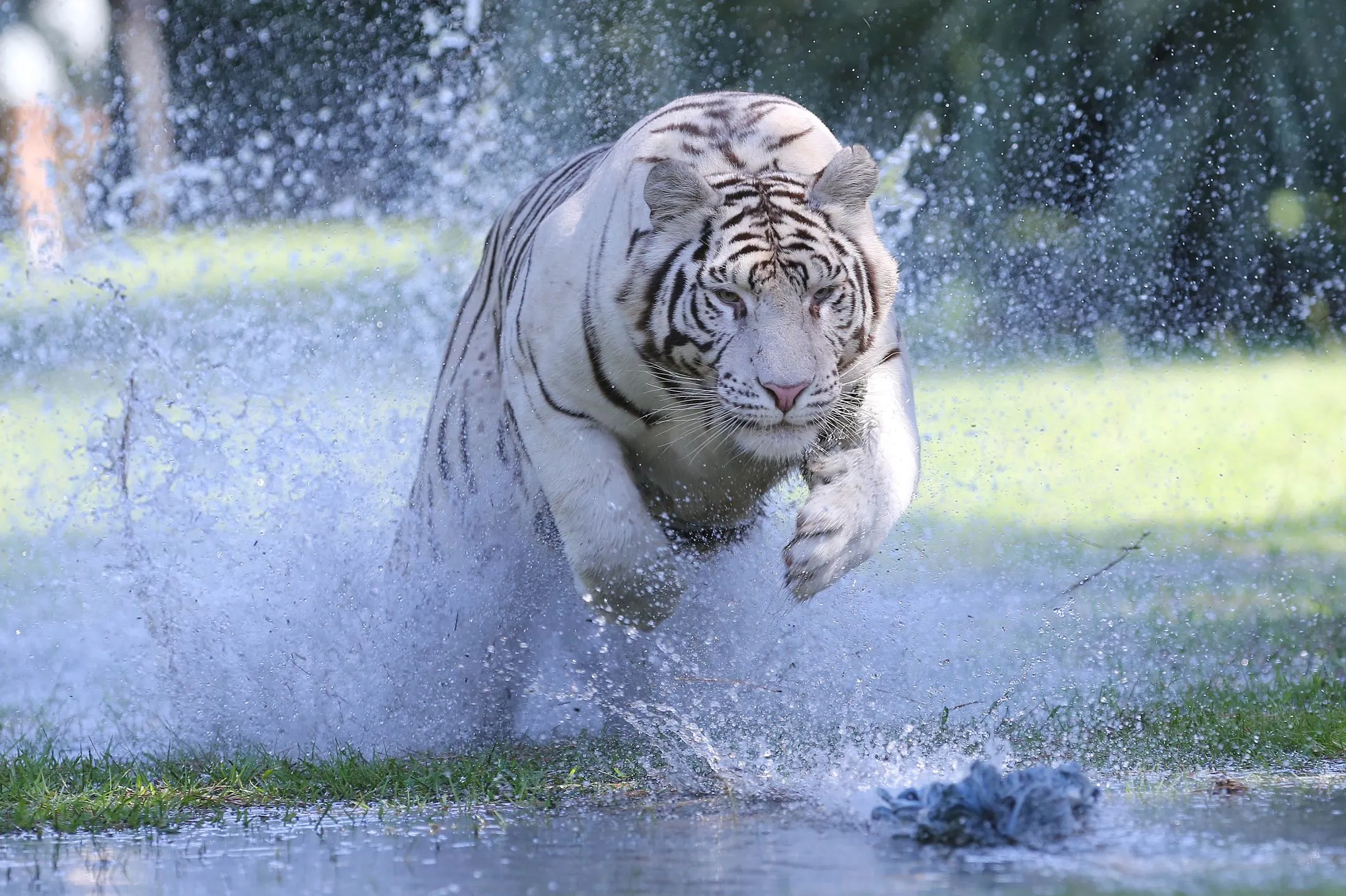 Now here's a terrifying game of cat and mouse! Charging up to 40mph in just three strides these Bengal tigers make a petrifying splash on the saturated earth. (Photo by Splash News)