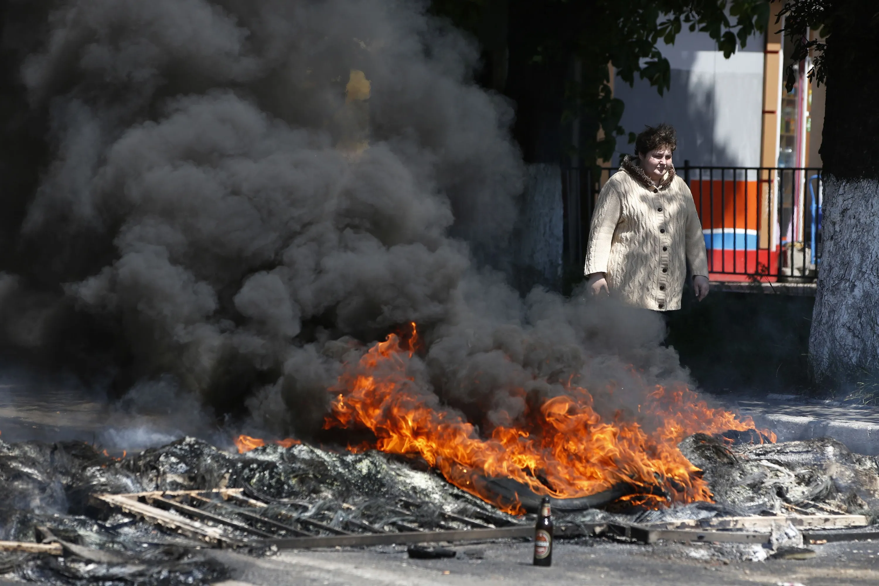 A woman walks past a burning barricade near the city hall in Mariupol, on May 10, 2014. (Photo by Marko Djurica/Reuters)