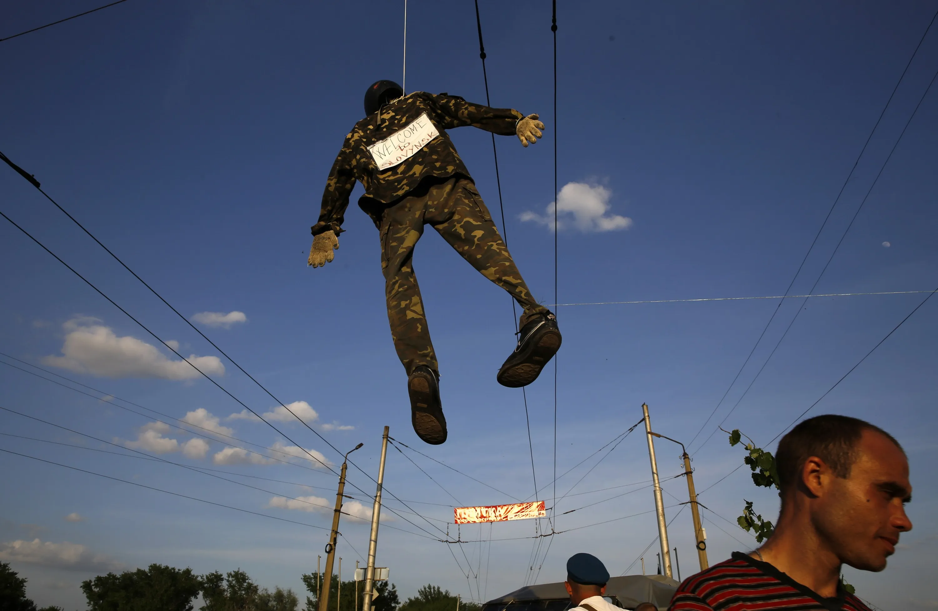 An effigy of a Ukrainian soldier, with a sign that reads “Welcome to Slovyansk”, hangs over a pro-Russian barricade on the outskirts of the eastern Ukrainian town, on May 10, 2014. (Photo by Yannis Behrakis/Reuters)