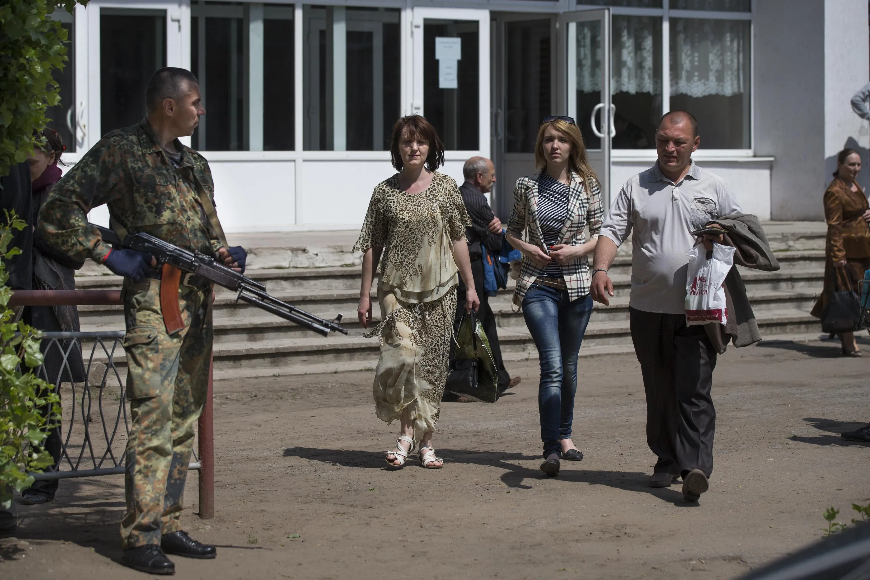 A gunman stands guard as local residents walk from a polling station in Slovyansk, eastern Ukraine, Sunday, May 11, 2014. Residents of two restive regions in eastern Ukraine engulfed by a pro-Russian insurgency cast votes Sunday in contentious and hastily organized independence referendums, which have been rejected as illegal by the Ukrainian government and the West. (Photo by Alexander Zemlianichenko/AP Photo)