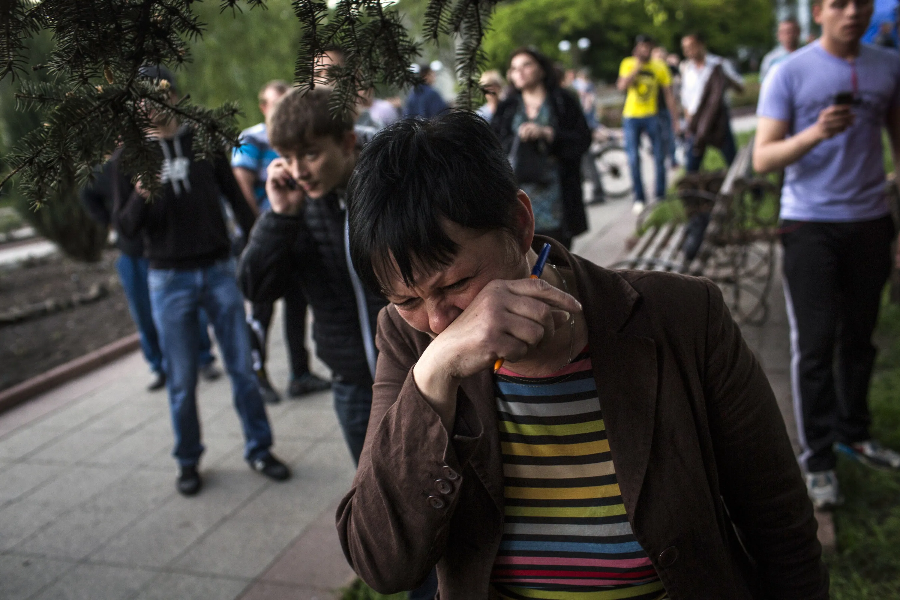 A woman reacts after Ukrainian national guardsmen opened fire on a crowd outside a town hall in Krasnoarmeisk, about 30 kilometers (20 miles) from the regional capital, Donetsk, Ukraine, Sunday, May 11, 2014. Although the voting in the Donetsk and Luhansk regions appeared mostly peaceful, Ukrainian national guardsmen opened fire on a crowd outside a town hall in Krasnoarmeisk, and an official with the region’s insurgents said there were fatalities. (Photo by Manu Brabo/AP Photo)