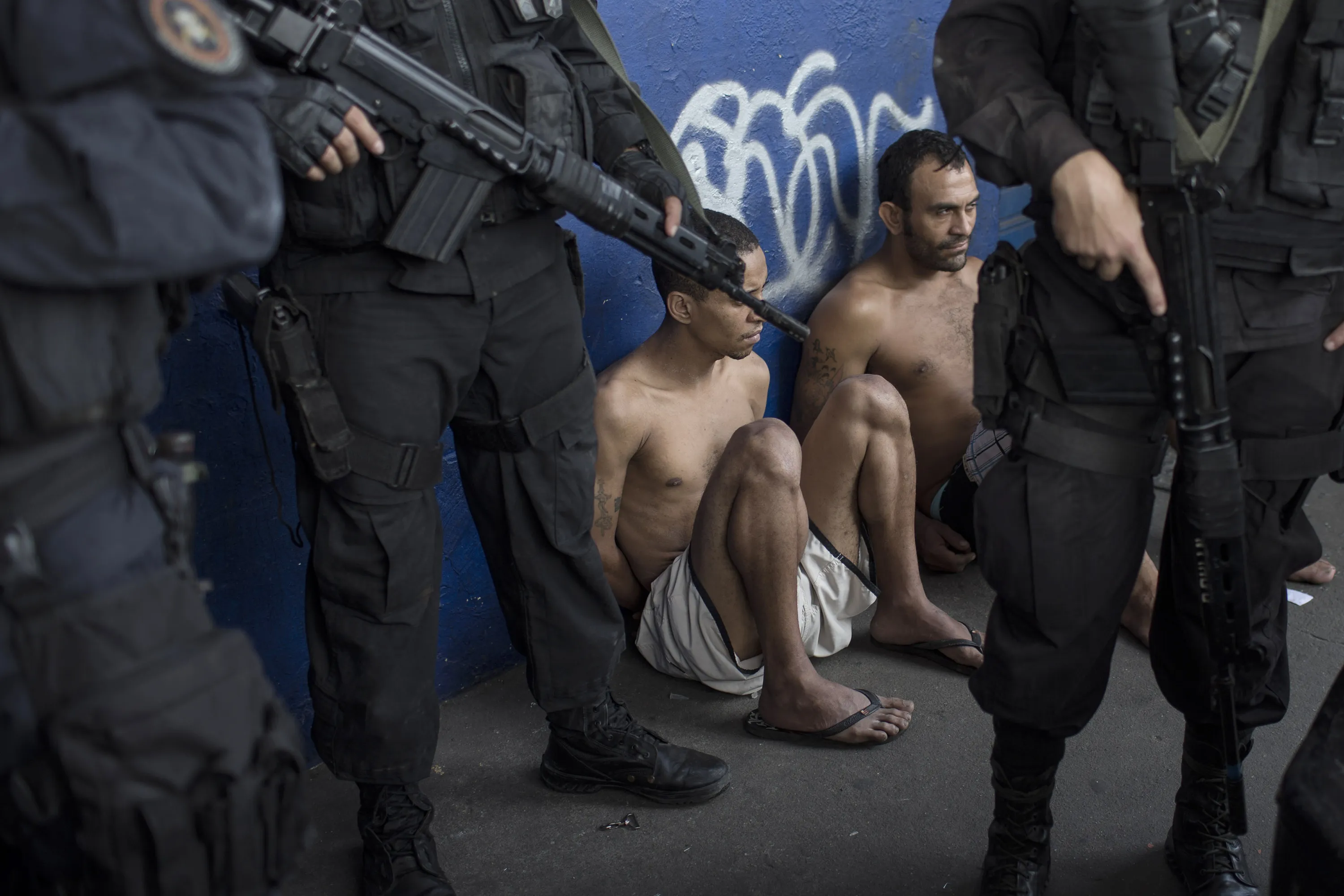 Suspects sit with their hands behind their backs after their arrest during a police operation in the Nova Holanda slum, part of the Complexo da Mare, in Rio de Janeiro, Tuesday, June 25, 2013. The police operation aimed to capture an alleged looter, who according to police killed an officer after a peaceful protest Monday night. At least seven people died and two suspects were captured during Tuesday's operation, according to police. (Photo by Felipe Dana/AP Photo)