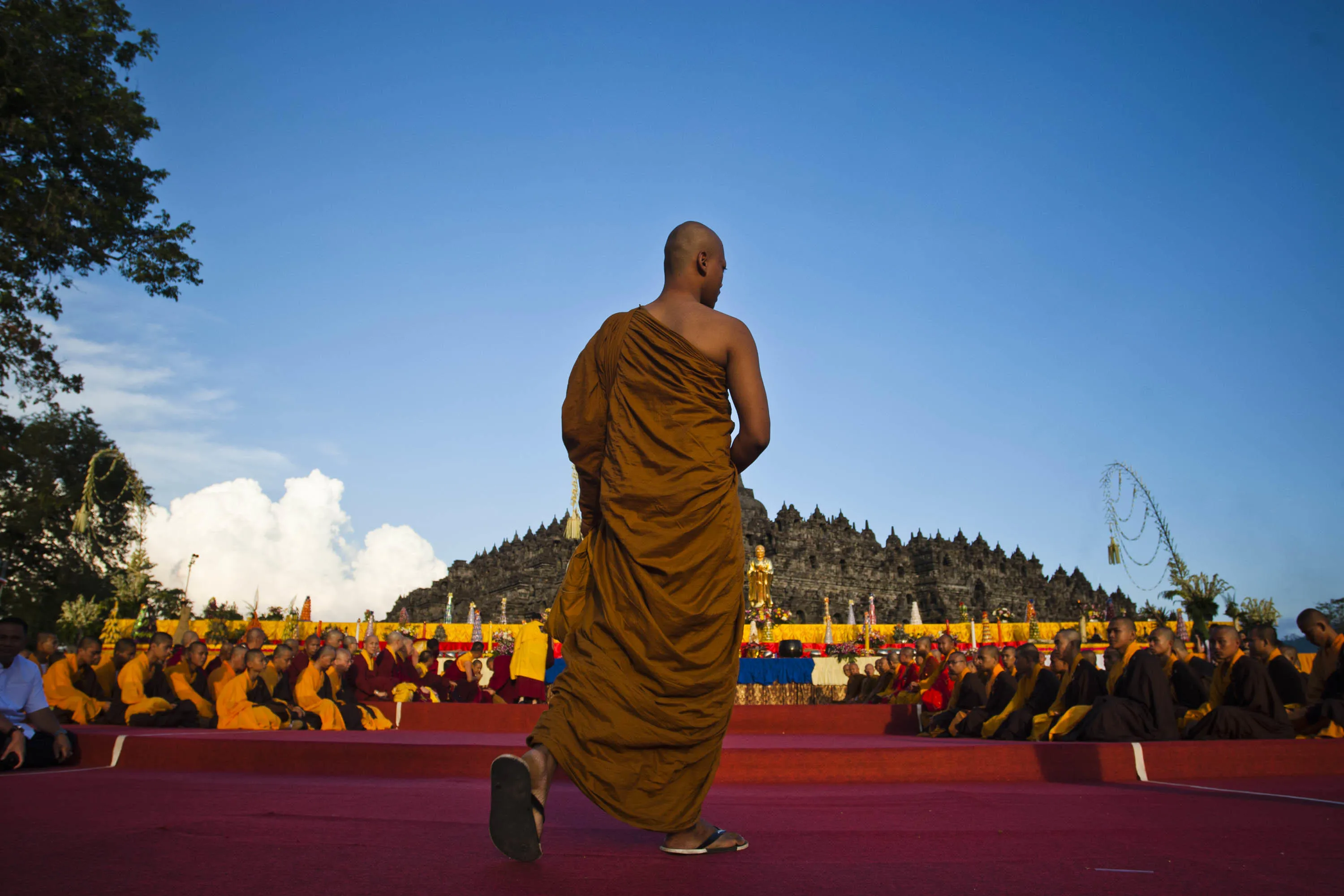 Buddhist monks attend at Borobudur temple during Vesak Day, commonly known as “Buddha's birthday”, at the Borobudur Mahayana Buddhist monument on May 17, 2011 in Magelang, Indonesia. Buddhists in Indonesia celebrate Vesak at the monument anually, which makes it the most visited tourist attraction in Indonesia. It is observed during the full moon in May or June, with the ceremony centred at three Buddhist temples by walking from Mendut to Pawon and ending at Borobudur. The stages of life of Buddhism's founder, Gautama Buddha, which are celebrated at Vesak are his birth, enlightenment to Nirvana, and his passing (Parinirvana). (Photo by Ulet Ifansasti/Getty Images)