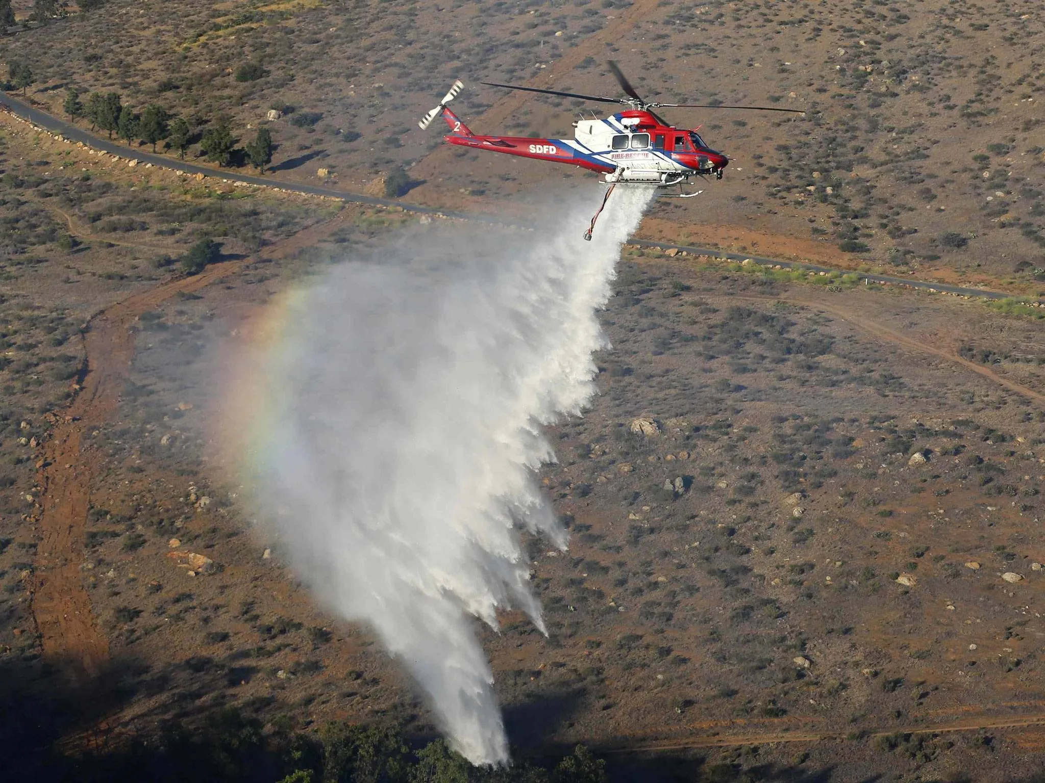 A helicopter drops water on a burning canyon next to homes as firefighters battle the Bernardo Fire, north of San Diego, California. (Photo by Mike Blake/Reuters)