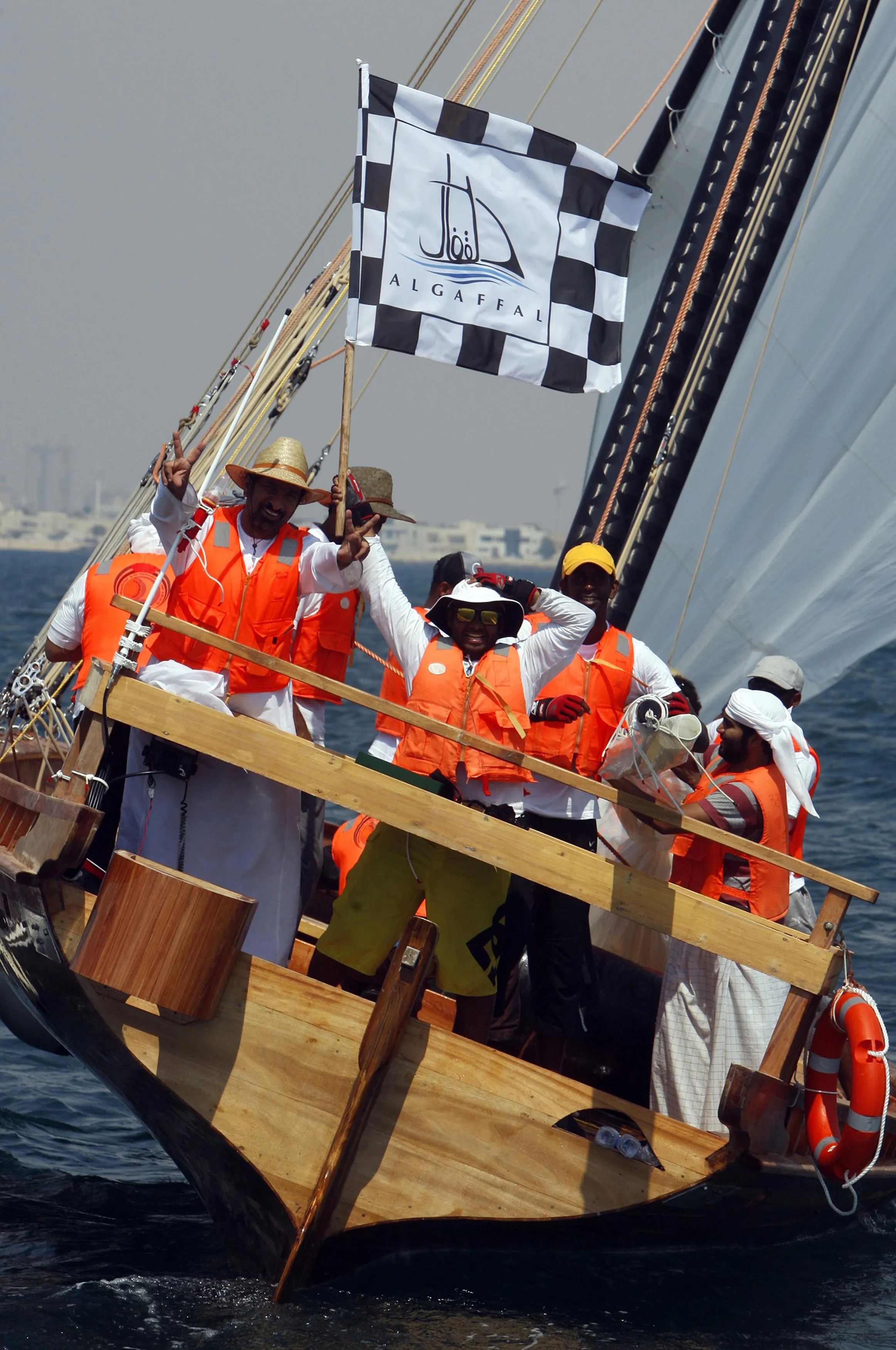 Navigator Ali Salem bin Kenaid al-Falasi (L) flashes a victory sign while his crewmate Rashed al-Humairi waves a flag to celebrate the team's victory in the Al Gaffal race, a long-distance traditional wooden boat or dhow sailing race, near Dubai May 18, 2014. (Photo by Martin Dokoupil/Reuters)