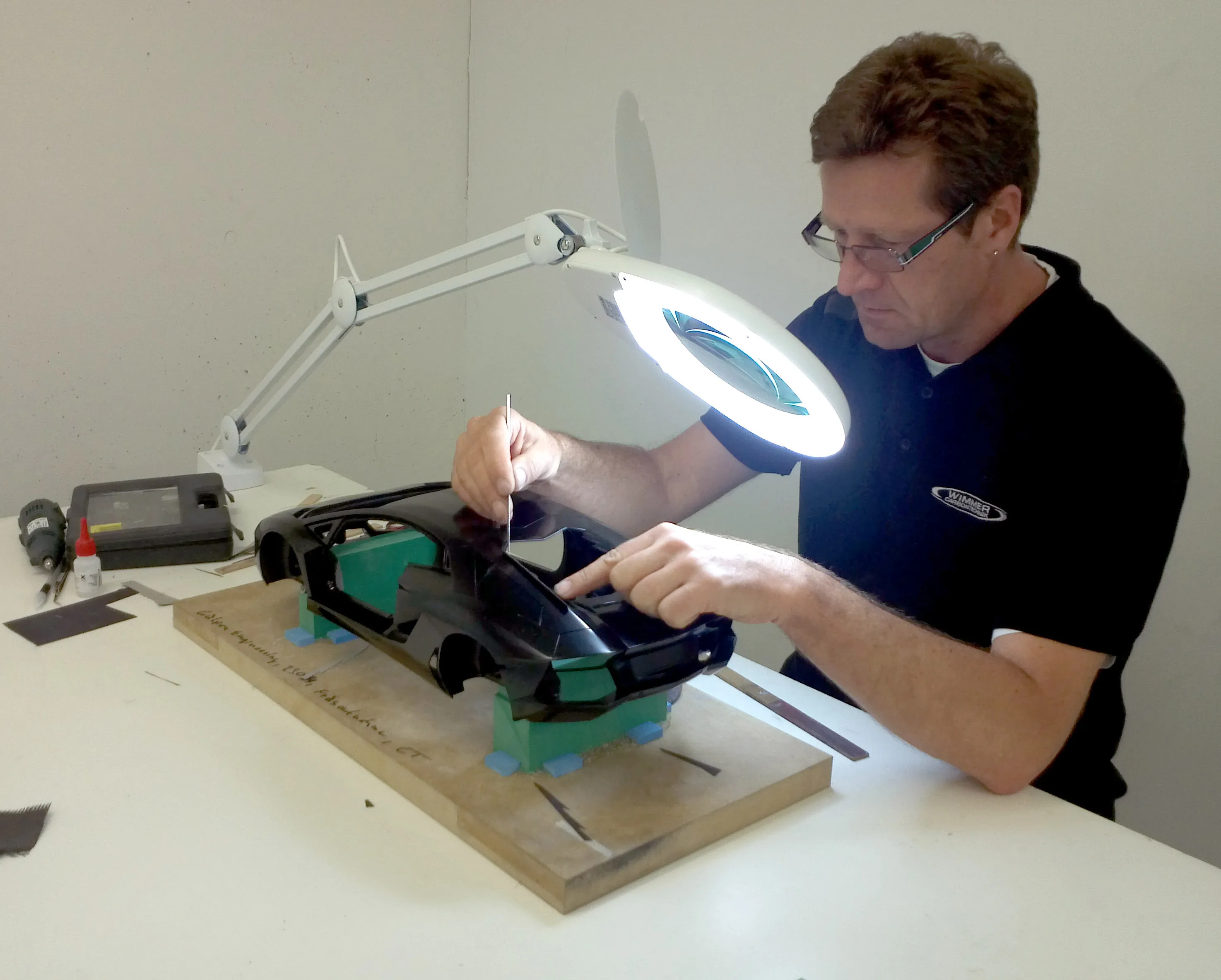 Engineer Robert Gülpen's replica model of a Lamborghini Aventador LP 700-4 as work is in progress, being worked on by a carbon fibre specialist, in Bavaria, Germany. This is the world's most expensive model car, made from carbon fibre and covered in a thin layer of pure gold. The 1:8 scale replica Lamborghini Aventador LP 700-4, designed by German engineer Robert Gülpen, is available to buy for £200,000. But amazingly this model – currently on display at the Lamborghini showroom in Dubai – is just a prototype for a solid gold model, which will go up for auction in 2014 with a price tag of £4.6 million. The prototype car is made of carbon fibre and covered in a thin layer of pure gold. The rest of the bodywork contains 25 kilogrammes of precious metal and is carved out of a 500-kilogramme block of 22-carat gold. The full-sized car will have a V12 engine producing 700 bhp, the report said. The car will enter the Guinness Book of World Records under three categories, including the most expensive model car, the most secure showcase that features bulletproof windows and the most luxurious logo. (Photo by Robert Gulpen/Barcroft Media)