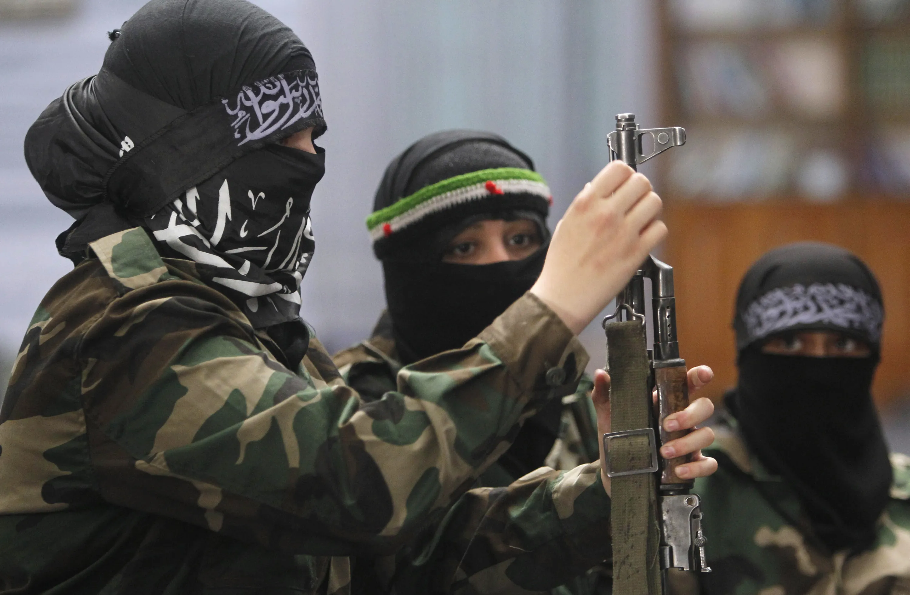 A female member of the Ahbab Al-Mustafa Battalion holds a rifle during military training in a mosque in the Seif El Dawla neighbourhood in Aleppo June 24, 2013. (Photo by Muzaffar Salman/Reuters)