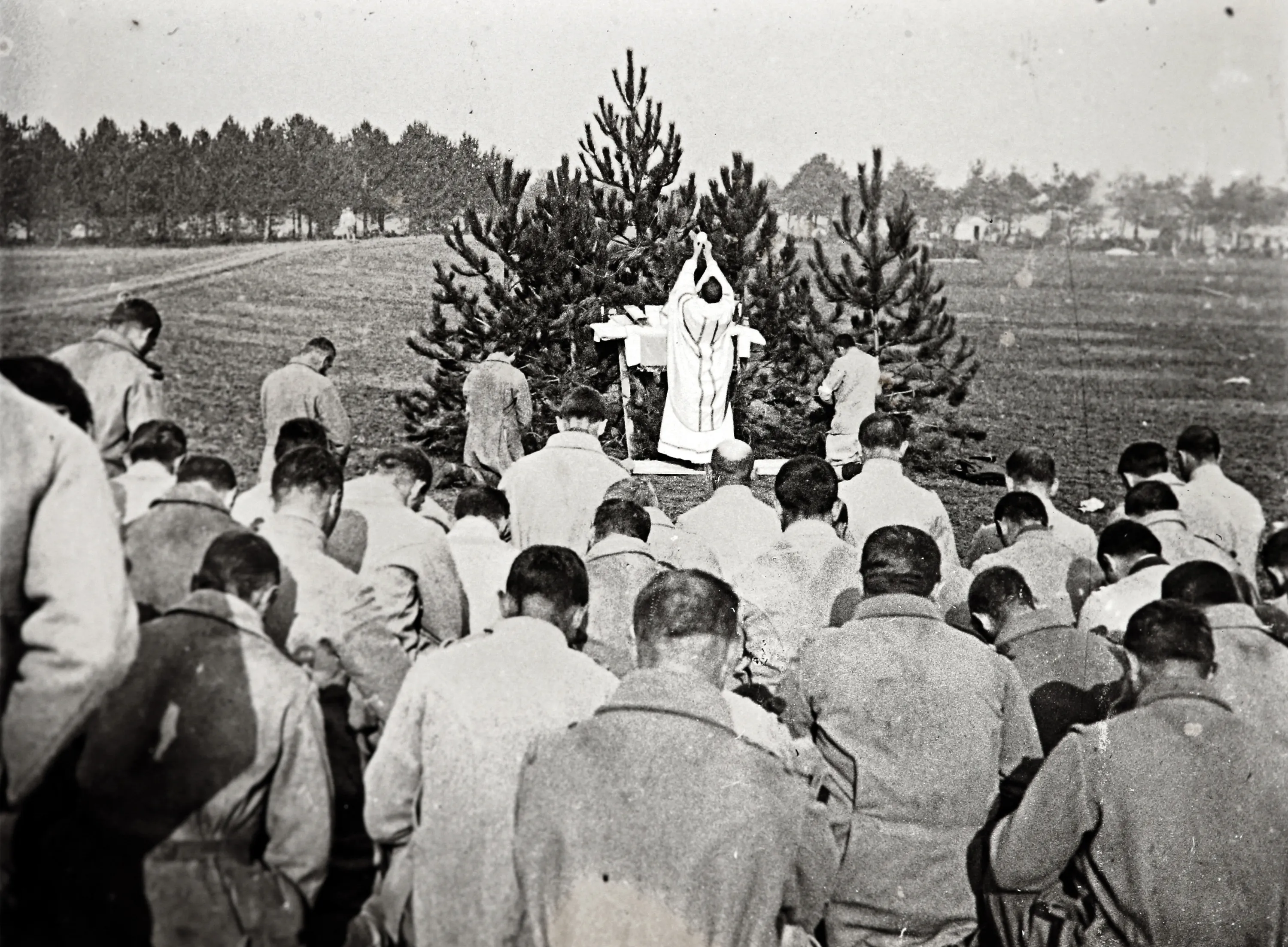 An archive picture shows a priest conducting mass for French soldiers on the Champagne front, eastern France in 1915. (Photo by Collection Odette Carrez/Reuters)