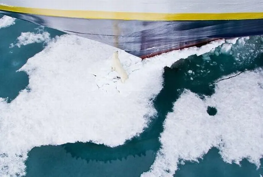 A young female polar bear came to the vessel, which was stopped and shut down in fast ice on the island of Spitsbergen in the Svalbard Archipelago, Norway. She was playing right in front of cameras entertaining people.