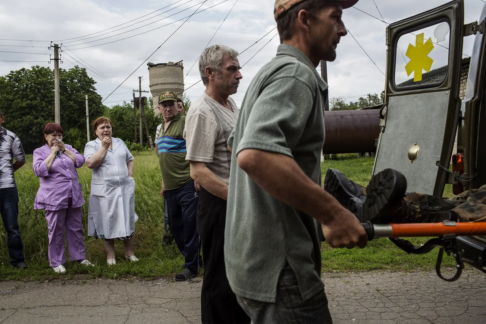 Men carry the body of a killed Ukrainian army soldier out of a van and into the morgue in Volnovakha, on May 22, 2014, after an ambush at a check point between Blohoddatne and Horlivka, 50km south of Donetsk. Pro-Russian rebels firing mortar shells and grenades killed 14 Ukrainian soldiers today, the blackest day yet for the military and a dramatic ratcheting up of tensions just three days before a crunch election. The attacks in the eastern industrial belt near the Russian border underscored the difficulties of the embattled Kiev government in resolving a crisis that is threatening to tear the country apart. (Photo by Fabio Bucciarelli/AFP Photo)