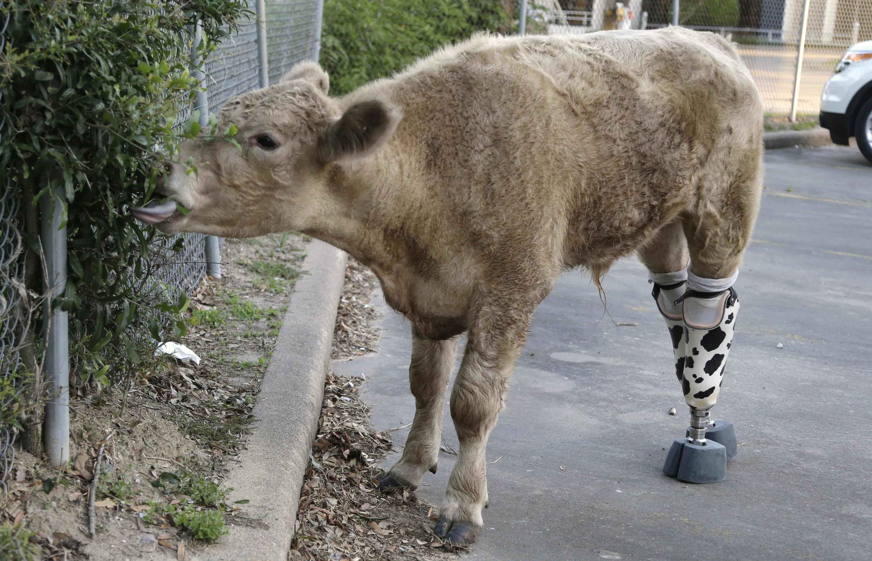 Wearing his new prosthetic legs Hero gets a taste of shrubbery Wednesday, May 21, 2014, in Houston. The abandoned calf rescued from a Virginia farm a year ago and brought to Texas after it nearly died is getting permanent prosthetics to replace back hooves that had to be amputated because of frostbite. (Photo by Pat Sullivan/AP Photo)