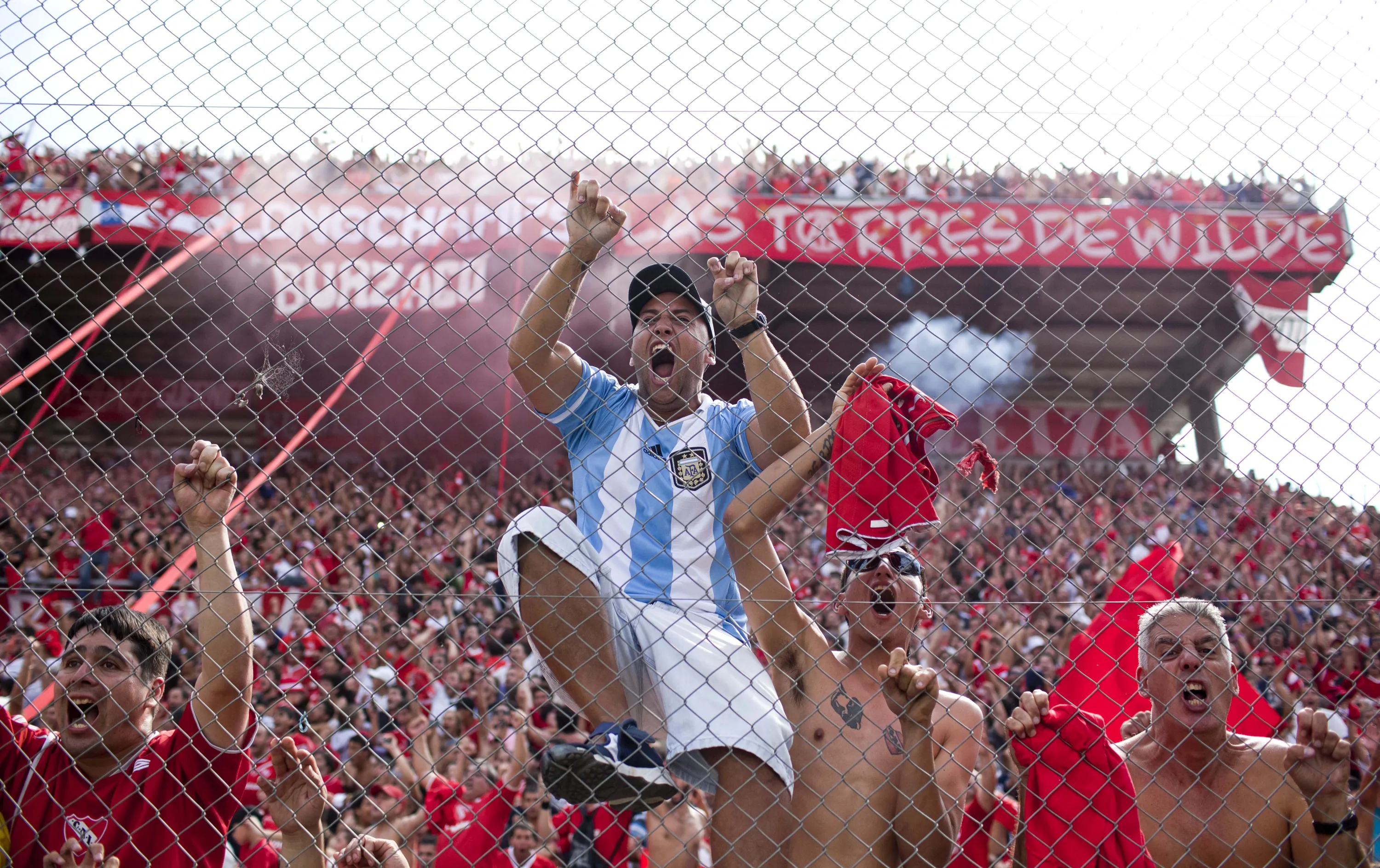 Independiente's fans celebrate their team's fourth goal during an Argentine league soccer match against Racing Club in Buenos Aires, Argentina, Saturday April 14, 2012. (Photo by Natacha Pisarenko/AP Photo)