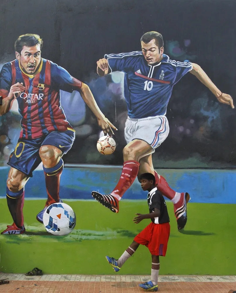 A boy kicks a soccer ball in front of a mural of Argentina's Lionel Messi (L) and France's Zinedine Zidane at a playground ahead of the World Cup soccer tournament in Brazil, in Chennai June 3, 2014. REUTERS/Babu