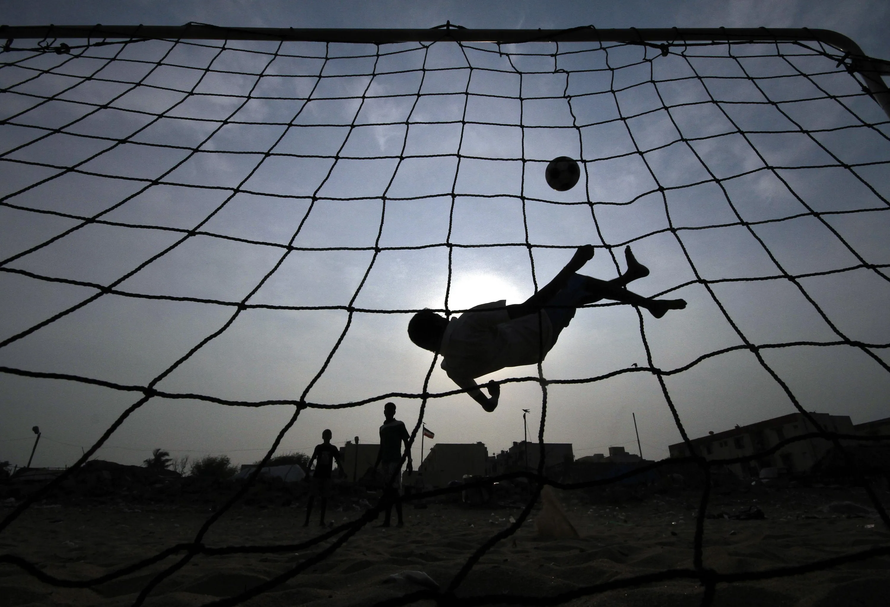 A boy does a bicycle kick as he practises on the Marina beach ahead of the World Cup soccer tournament in Brazil, in Chennai June 4, 2014. REUTERS/Babu