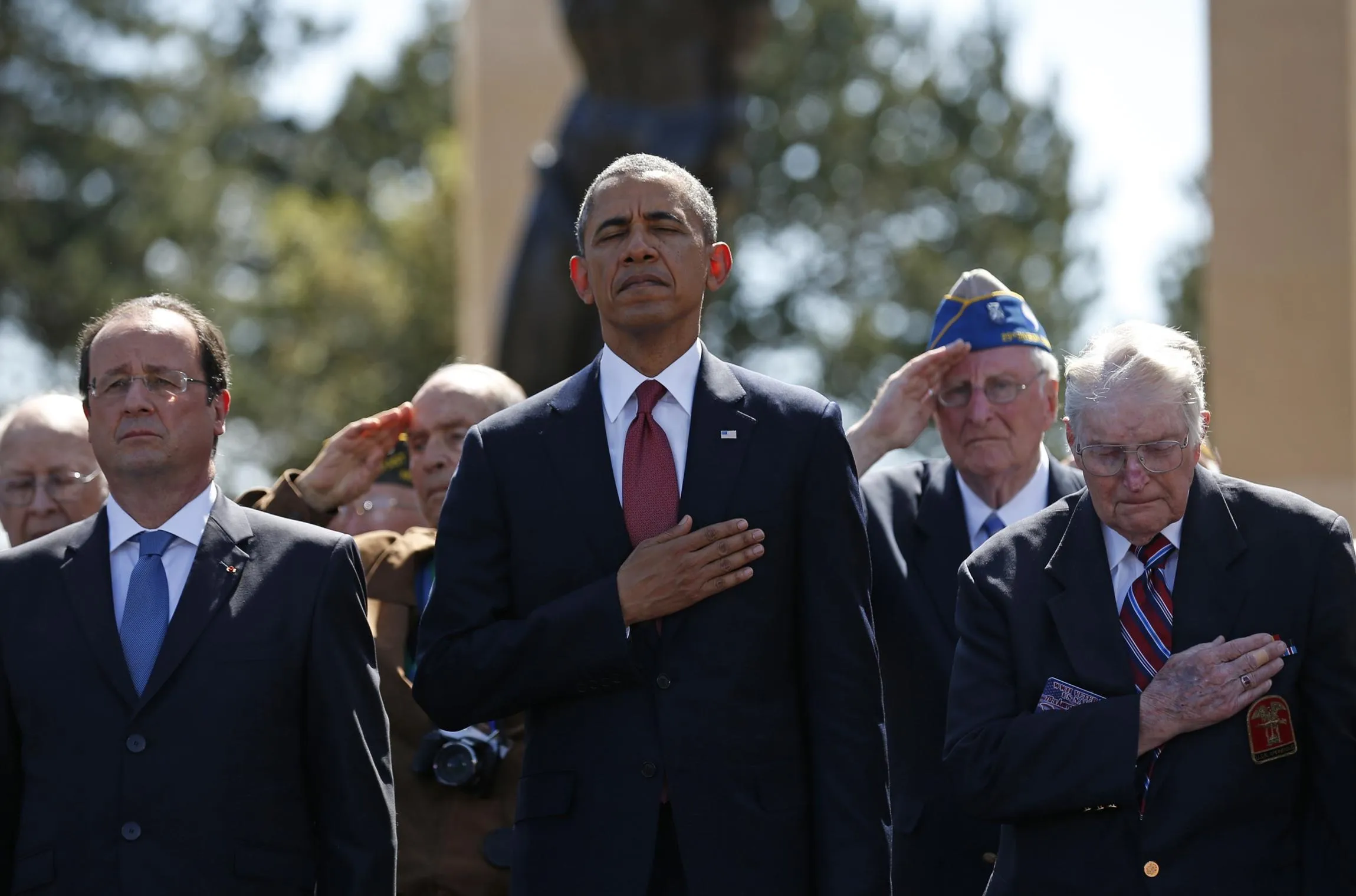 U.S. President Barack Obama and French President Francois Hollande participate in the 70th French-American Commemoration D-Day Ceremony at the Normandy American Cemetery and Memorial in Colleville-sur-Mer June 6, 2014. . REUTERS