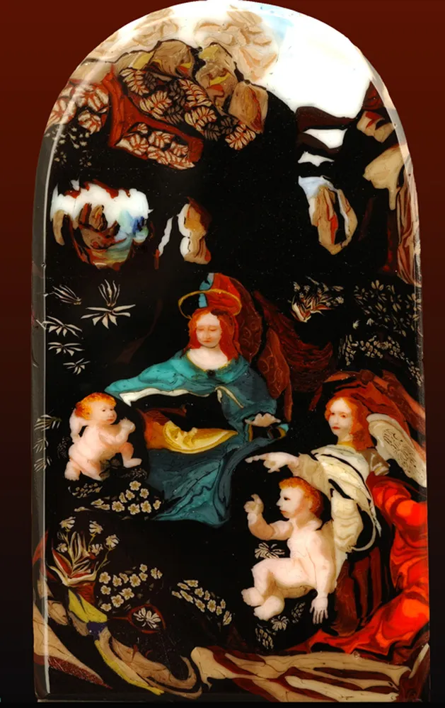 California-based glass artist Loren Stump specializes in a form of glasswork called murrine, where rods of glass are melted together and then sliced to reveal elaborate patterns and forms. While the murrina process appeared in the Mideast some 4,000 years ago, Stump has perfected his own technique over the past 35 years to the point where he can now layer entire portraits and paintings in glass before slicing them to see the final results. His most complex piece to date is a detailed interpretation of Leonardo da Vinci’s Virgin of the Rocks, which involved hundreds of glass components that were melted into a final piece.