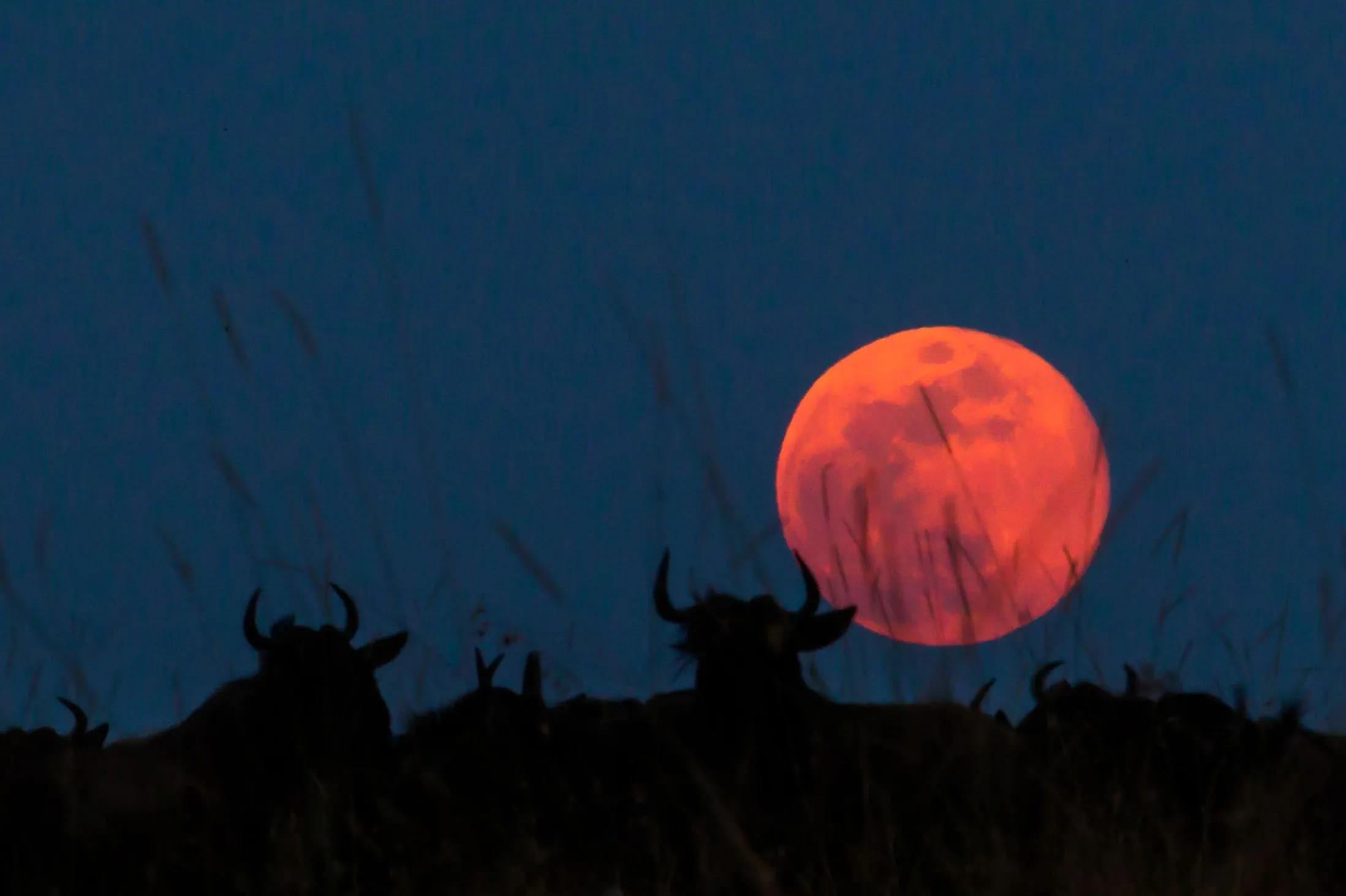 “African Fire”: Wildebeest with red moon in background at sunset. (Photo by Paul Goldstein/Rex Features)