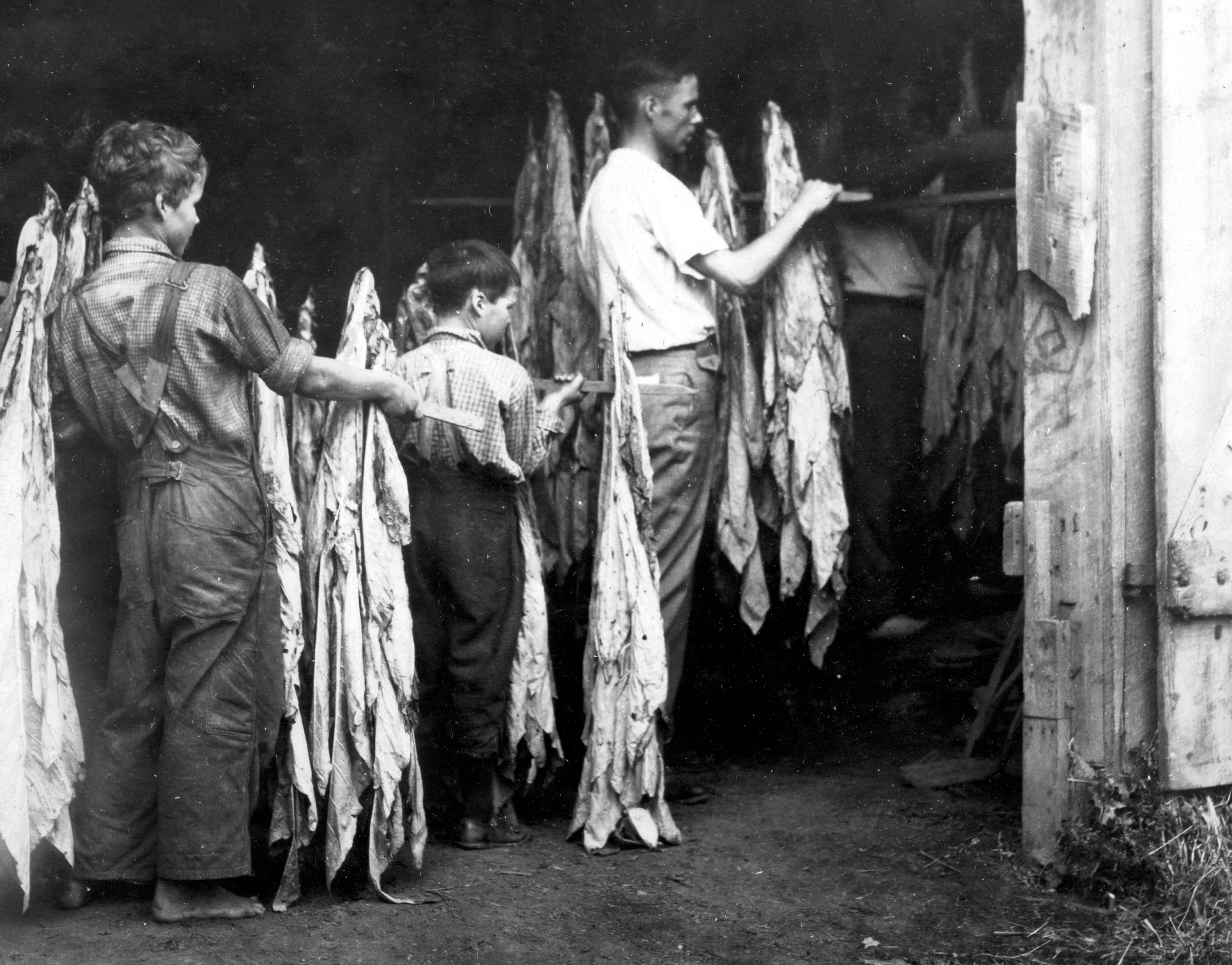 View of two young boys assisting in the housing of tobacco in the barn of WL Fugate, Hedges Station, KY, 1916. The boys attend Schoolsville School but it has not yet opened on account of repairs. (Photo by Lewis W. Hine/Buyenlarge/Getty Images)
