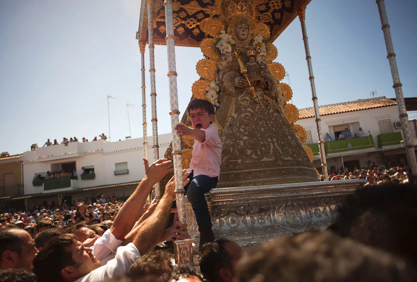 A child cries after being placed onto the float an effigy of the virgin Mary as it is carried during a procession in the village of El Rocio, southern Spain on June 9, 2014 also home to the statue of the “Madonna of the Dew” that has been worshipped since 1280. El Rocio pilgrimage is the largest in Spain with hundreds of thousands of devotees wearing traditional outfits converging in a burst of colour as they make their way on horseback and decorated carriages across the Andalusian countryside. (Photo by Jorge Guerreo/AFP Photo)