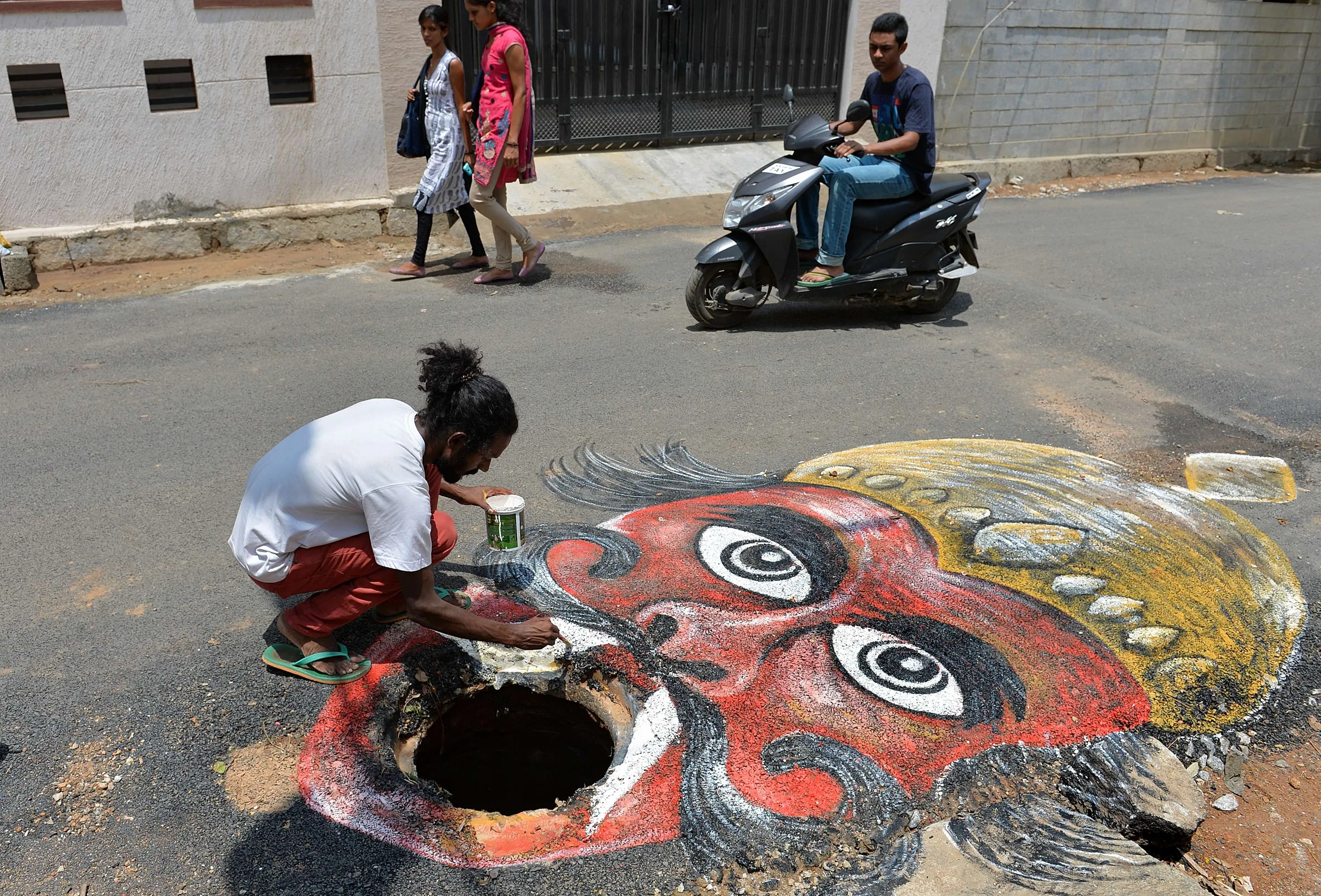 Indian artist Badal Nanjundaswamy uses the opening of an unattended manhole in the middle of a road as a canvas to depict the Hindu God of death “Yama” waiting to gobble up unwary pedestrains or motorists in Bangalore on June 6, 2014. The art installation was executed to draw the attention of the responsible municipal authorities into fixing the civic problem in an artistic way. (Photo by Manjunath Kiran/AFP Photo)