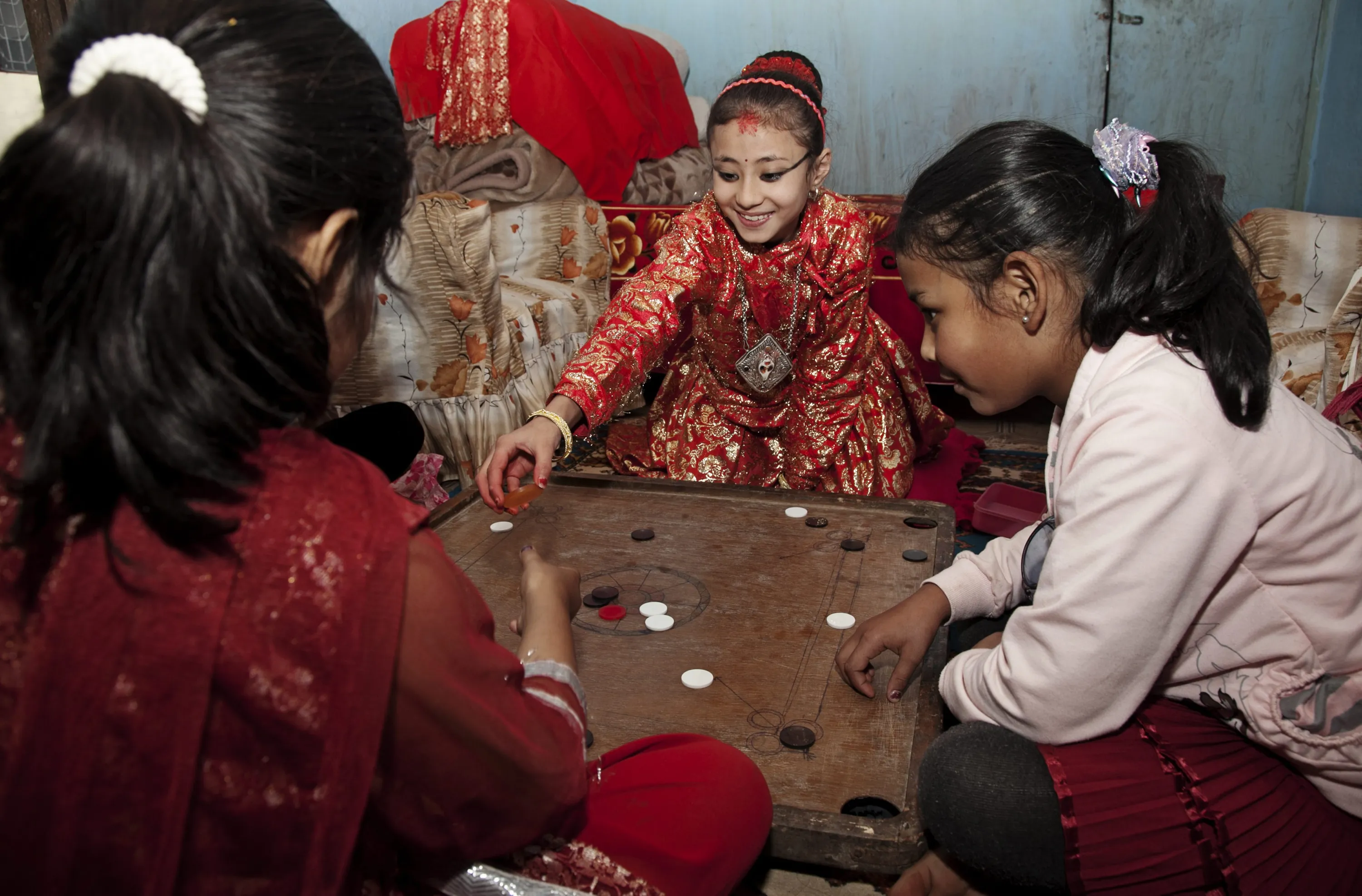 Kumari Samita Bajracharya (C) plays with her friends at Kumari Ghar in Patan City, Nepal, 03 April 2011. Kumari, or Kumari Devi, is a “living goddess”. The word literally means virgin in Nepali. The Living Goddesses are young pre-pubescent girls that are considered to be incarnations of the Hindu Goddess of Power, Kali. The Kumari retires when they reach puberty. The Kumari retires when she reaches puberty. (Photo by Narendra Shrestha/EPA)