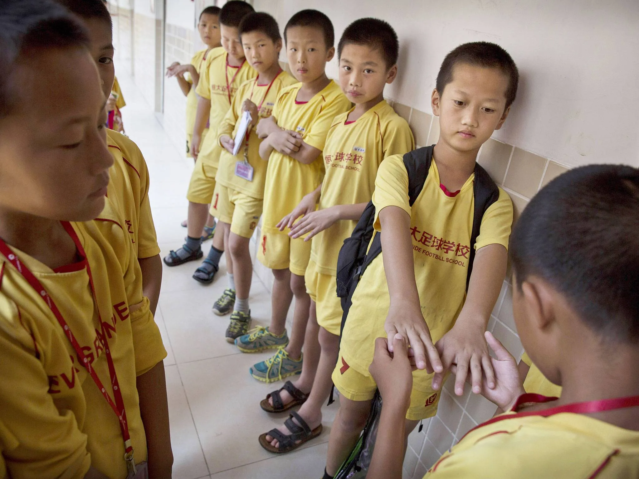 Young Chinese football players line-up to have their fingernails checked for cleanliness before training at the Evergrande International Football School near Qingyuan in Guangdong Province. (Photo by Kevin Frayer/Getty Images)