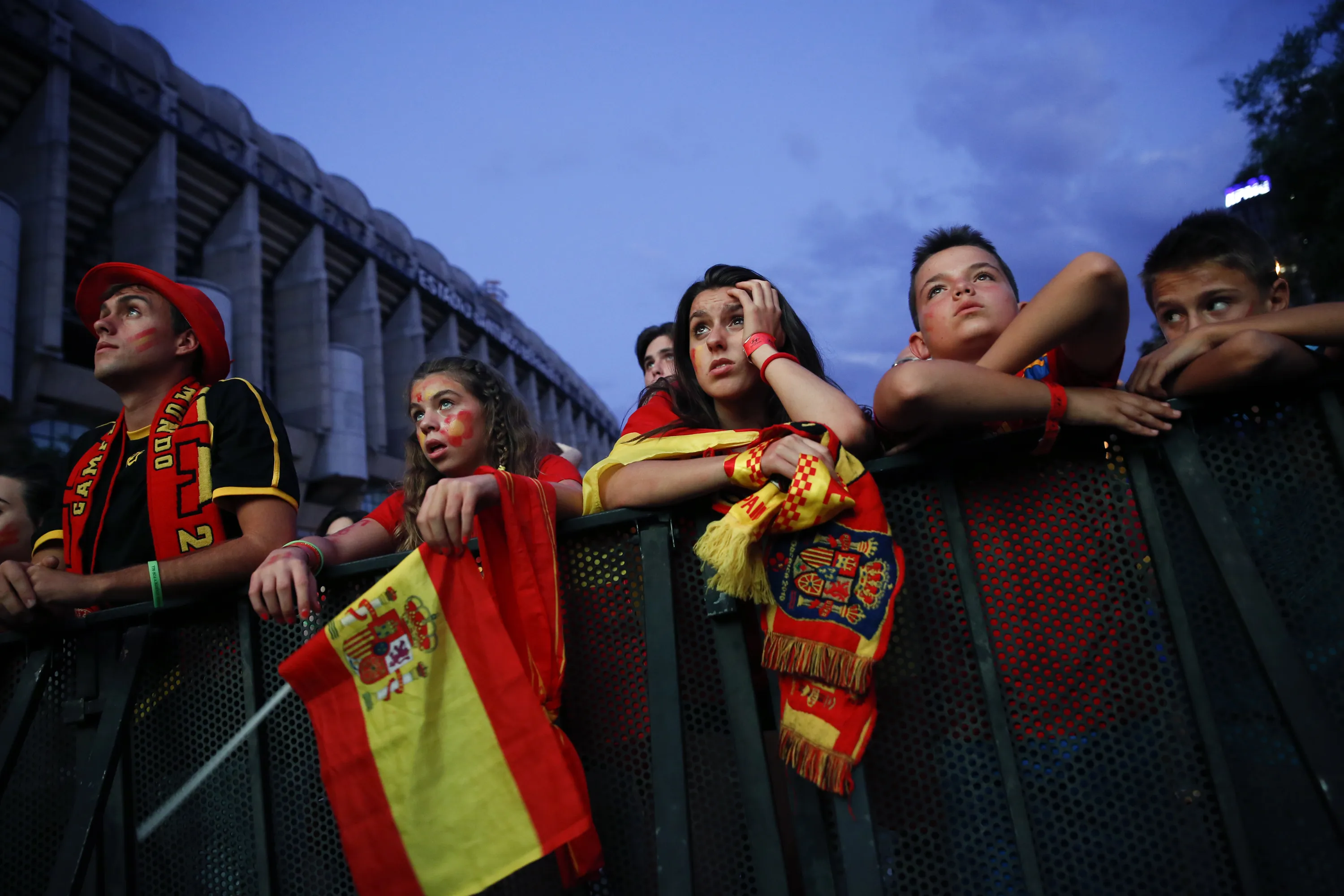 Spain supporters react as they watch the team's 2014 World Cup Group B soccer match against Netherlands on a giant screen at a fan park in Madrid, June 13, 2014. (Photo by Juan Medina/Reuters)