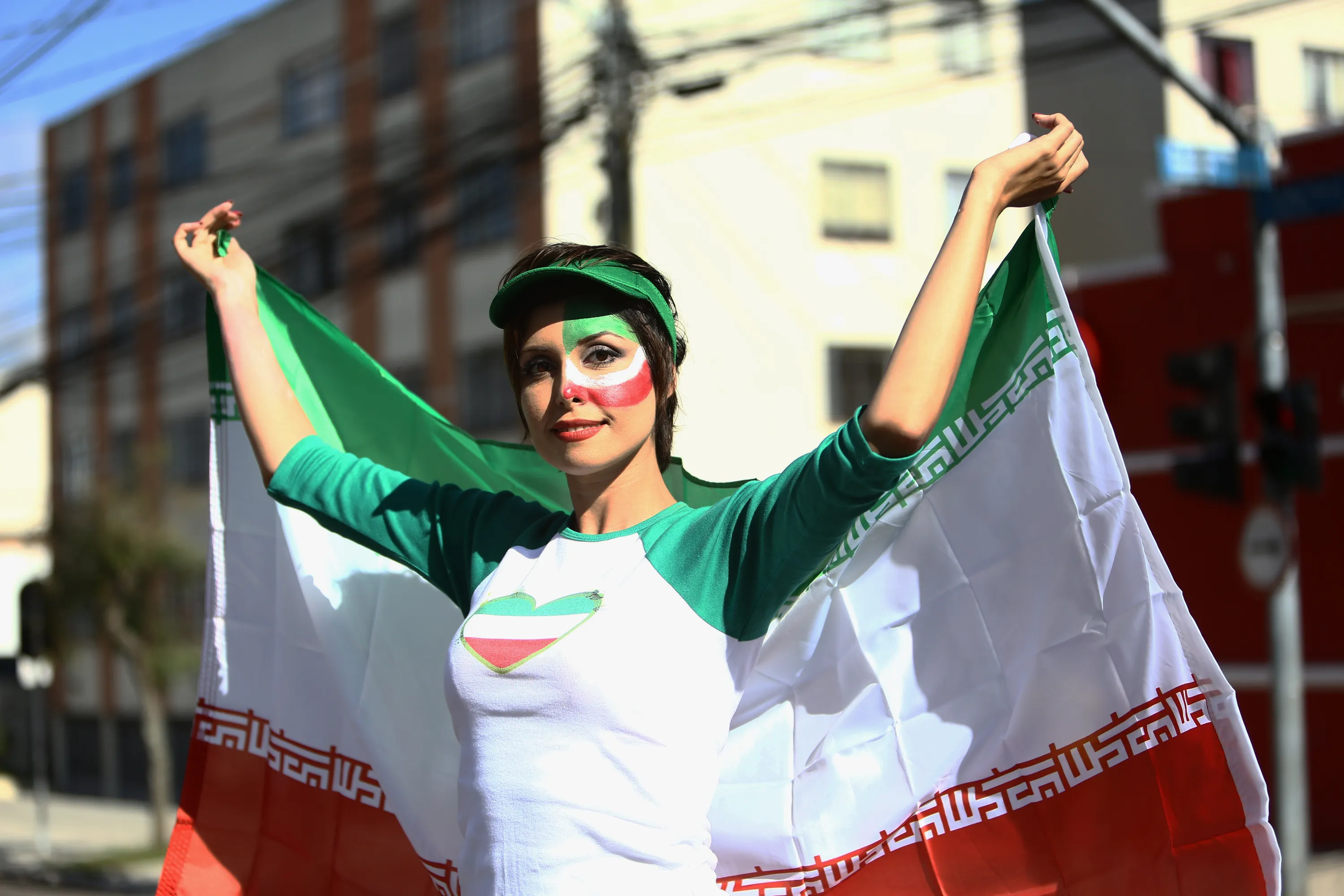 An Iranian fan cheers outside Baixada Arena in Curitiba on June 16, 2014, before the 2014 FIFA World Cup Group F football match between Iran and Nigeria. (Photo by Behrouz Mehri/AFP Photo)