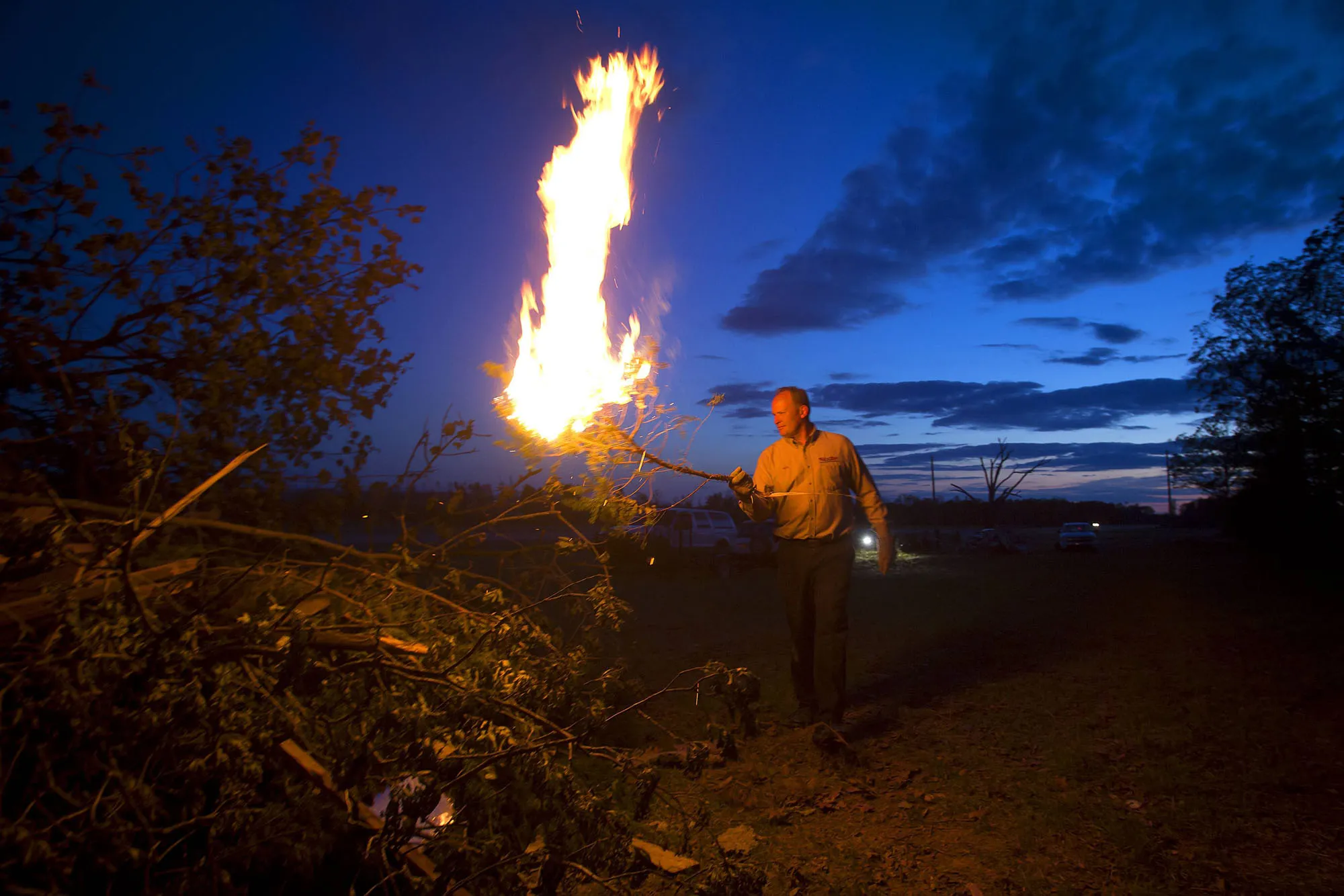 A man sets fire to a pile of debris after a tornado near Vilonia, Arkansas May 1, 2014. Flood warnings were posted across the eastern United States on Thursday after a powerful storm system unleashed record amounts of rain from New England to Florida. The remnants of the storm that dumped up to 11 inches of rain in the Florida Panhandle on Wednesday had moved into the Atlantic Ocean by early Thursday, said Dan Petersen (not pictured), a National Weather Service meteorologist. (Photo by Carlo Allegri/Reuters)