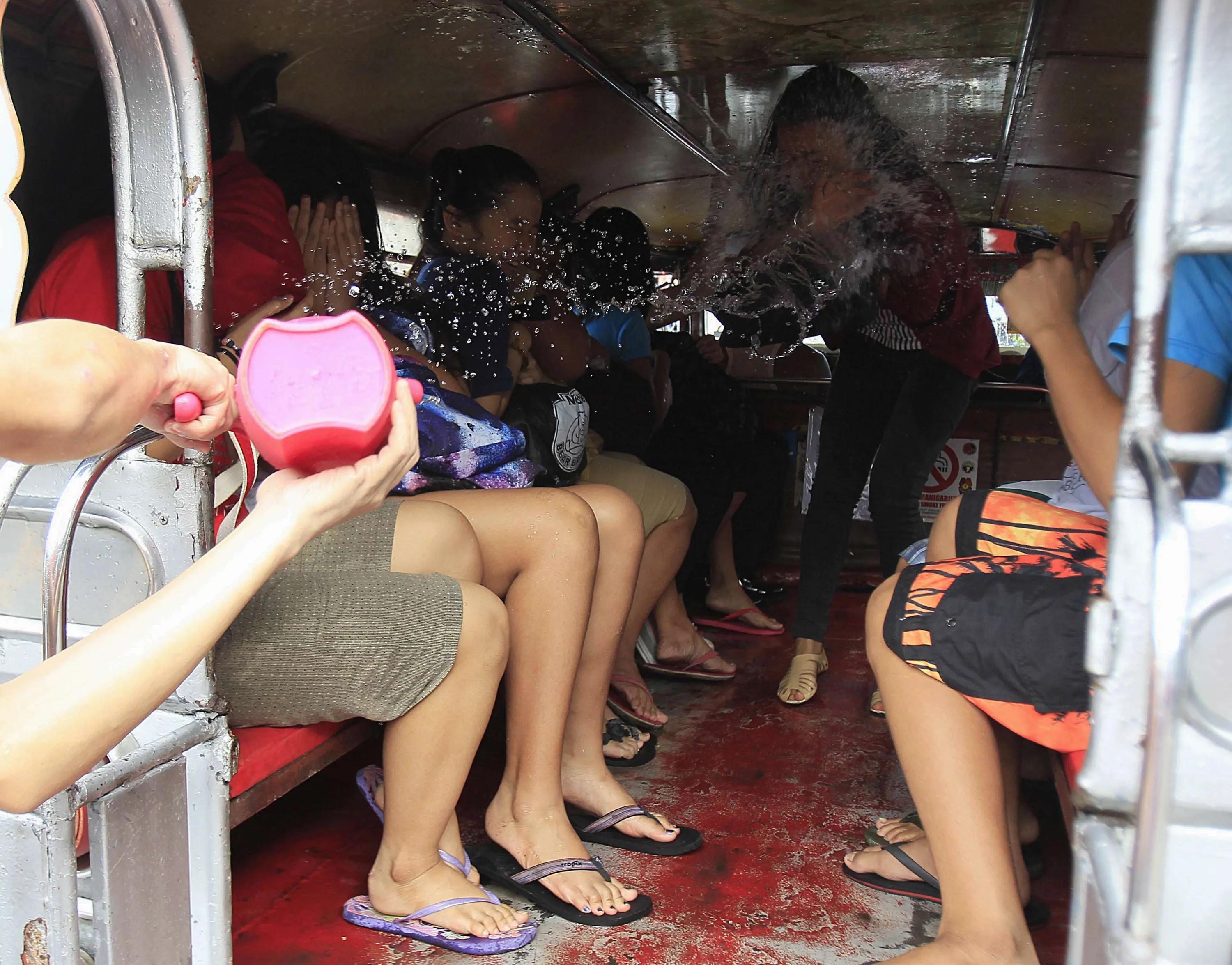 A resident douses passengers riding in a public vehicle with water, during St. John the Baptist Feast Day celebrations in San Juan city, metro Manila June 24, 2014. Residents participate in an annual city-wide waterfest in honour of their patron Saint John the Baptist. (Photo by Romeo Ranoco/Reuters)