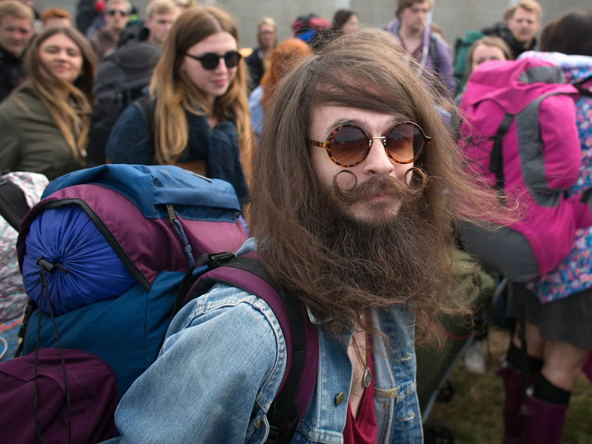 Bryan Patterson, 28, from Liverpool poses for a photograph as he queues to get into Worthy Farm in Pilton for the first day of the 2014 Glastonbury Festival on June 25, 2014 in Glastonbury, England. Gates opened today at the Somerset dairy farm that plays host to one of the largest music festivals in the world. Tickets to the event, which is now in its 44th year, sold out in minutes even before any of the headline acts had been confirmed. The festival, which started in 1970 when several hundred hippies paid £1, now attracts more than 175,000 people. (Photo by Matt Cardy/Getty Images)