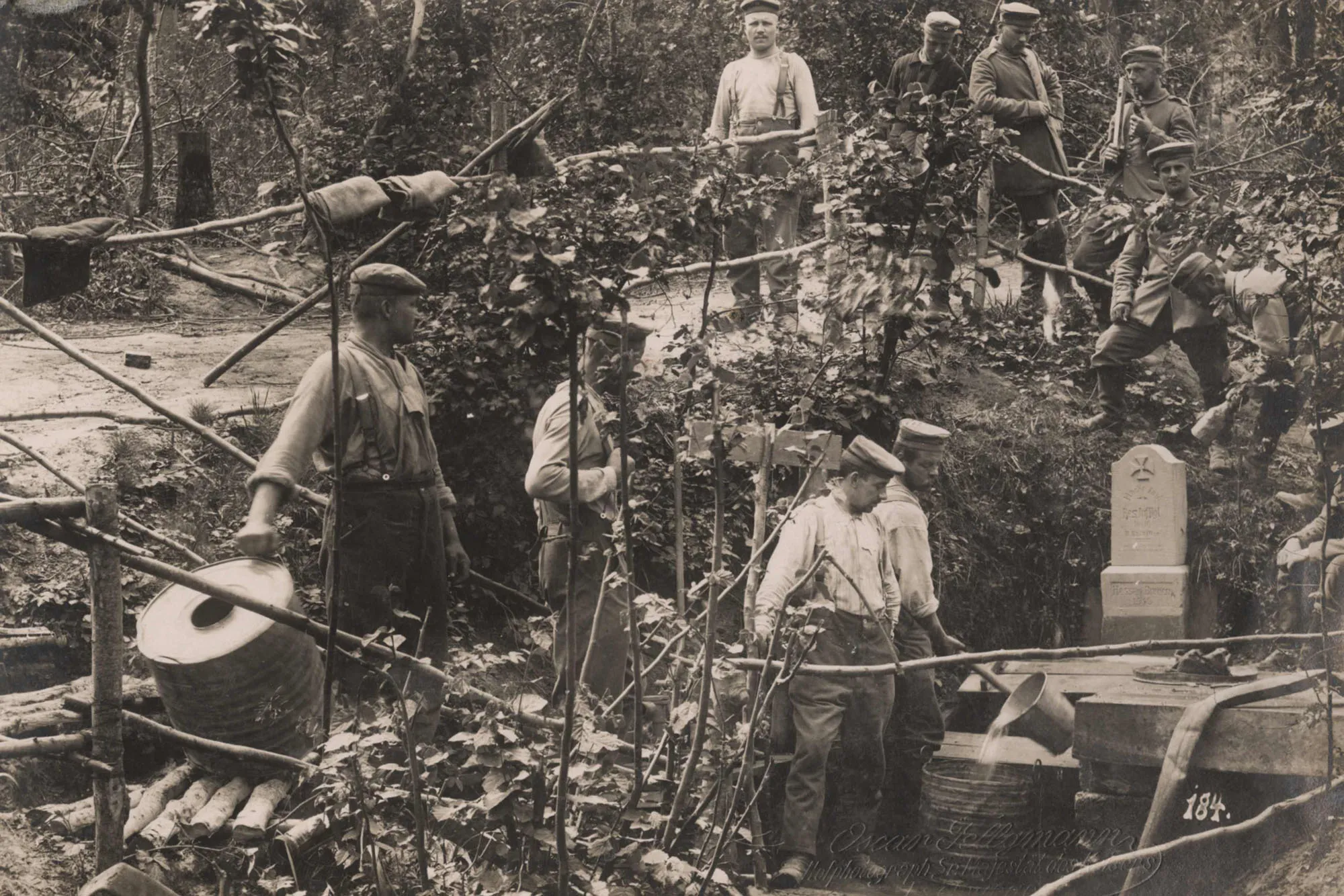 German infantry are shown collecting water on the Western Front, in this 1916 handout picture. This picture is part of a previously unpublished set of World War One (WWI) images from a private collection. The pictures offer an unusual view of varied and contrasting aspects of the conflict, from high tech artillery to mobile pigeon lofts, and from officers partying in their headquarters to the grim reality of life and death in the trenches. The year 2014 marks the centenary of the start of the war. (Photo by Reuters/Archive of Modern Conflict London)