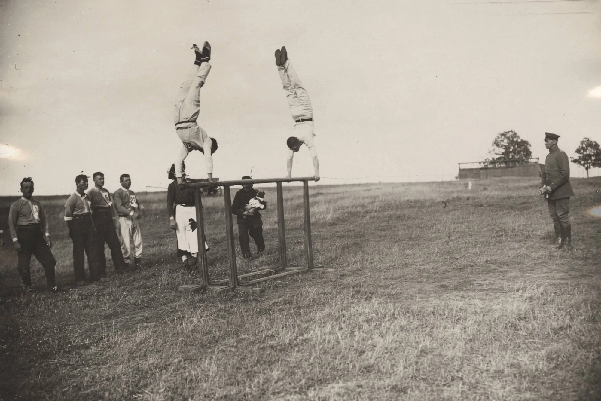 Officers of the Imperial German Air Service compete at a squadron athletics meeting near the Western Front in this 1917 handout picture. This picture is part of a previously unpublished set of World War One (WWI) images from a private collection. The pictures offer an unusual view of varied and contrasting aspects of the conflict, from high tech artillery to mobile pigeon lofts, and from officers partying in their headquarters to the grim reality of life and death in the trenches. The year 2014 marks the centenary of the start of the war. (Photo by Reuters/Archive of Modern Conflict London)
