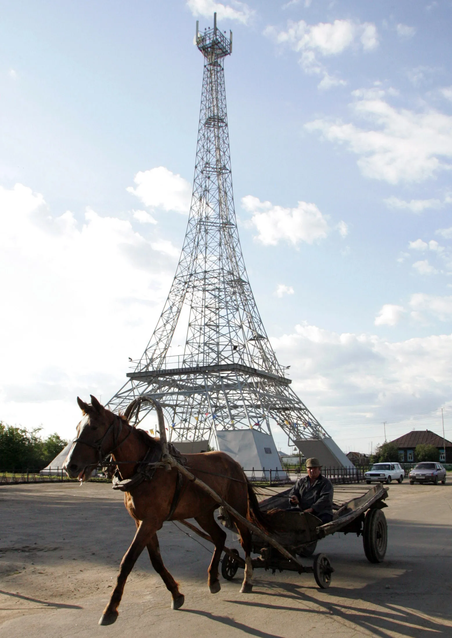 Russia: A horse and cart passes by a 50-meter copy of the Eiffel tower in the village Parizh (Paris) 59 miles southeast of Russia's Siberian city of Magnitogorsk, July 15, 2005. The village bears the name of the French capital since its foundation in the 19th century by Russian Cossaks who had returned from Paris after defeating Napoleon army. The tower was built by the local communication company as a tower for their equipment and a possible tourist attraction. (Photo by Sergei Karpukhin/Reuters)