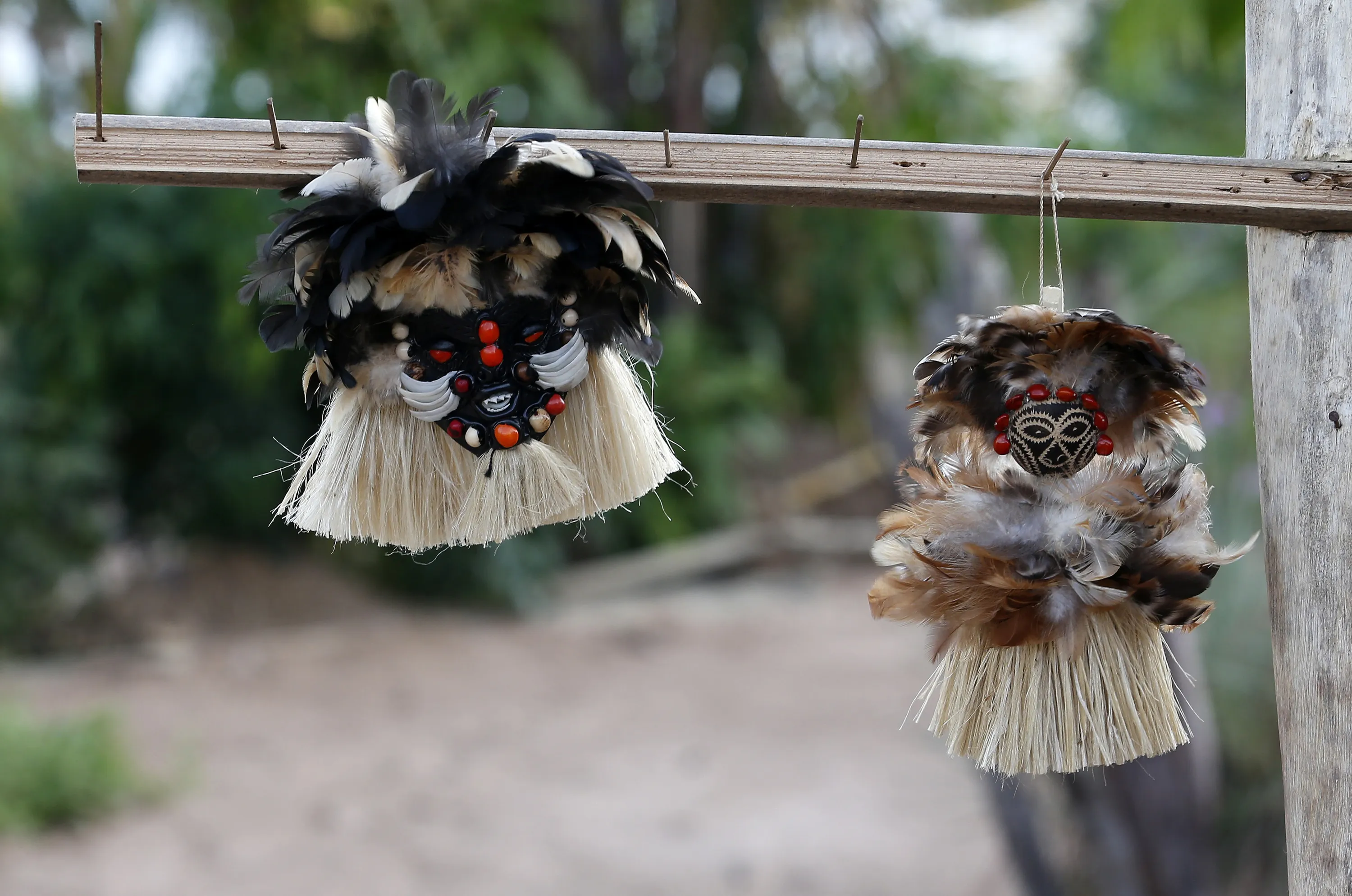 Crafts made by members of the AmazonianTatuyo tribe are displayed in their village in the Rio Negro (Black River) near Manaus city, a World Cup host city, June 23, 2014. Because of their proximity to host city Manaus and their warm welcome, the Tatuyo have enjoyed three weeks of brisk business thanks to the World Cup. Usually, they host between 10 and 30 tourists a day. During the World Cup, this number has rocketed to 250 a day, They have become richer and other communities now come to them to sell them juices and fishes. (Photo by Andres Stapff/Reuters)