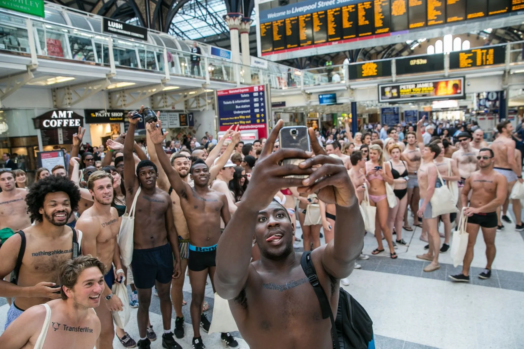 A flashing flashmob paraded around central London in their underwear in a protest over bank charges, on June 13, 2014. The semi-naked gang stripped down to their bras and briefs – giving morning commuters an eyeful. The scantily clad protesters stunned passengers at Liverpool Street Station and were also spotted in Angel, Farringdon and Kings Cross Square. More than 100 daring campaigners turned out for the event – which luckily coincided with the warmest day of the year so far. (Photo by Jeff Moore)