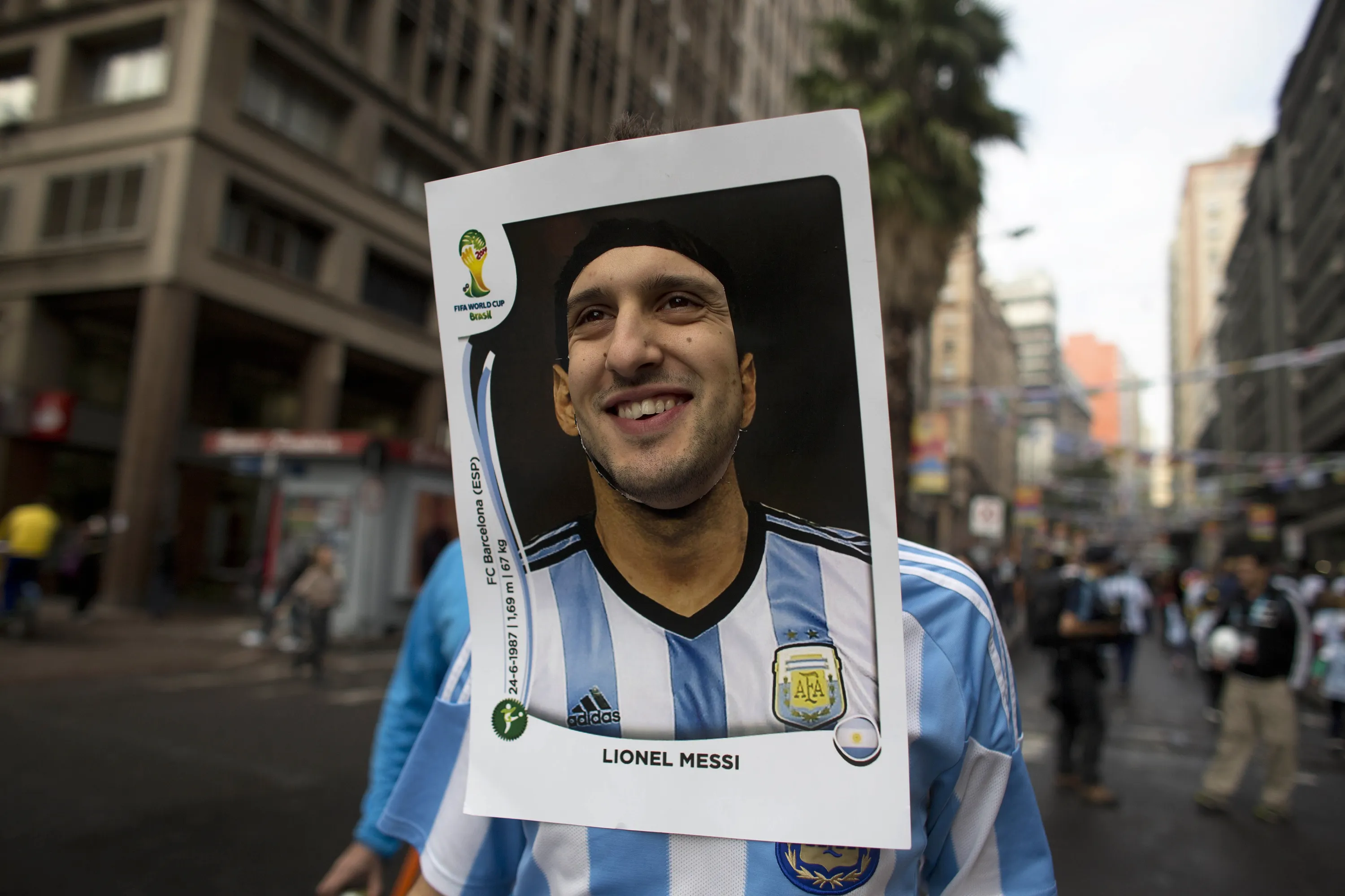 An Argentina soccer fan wears a cutout image of Argentine soccer star Lionel Messi as he heads to the stadium to see the World Cup match between Argentina and Nigeria in Porto Alegre, Brazil, Wednesday, June 25, 2014. (Photo by Dario Lopez-Mills/AP Photo)