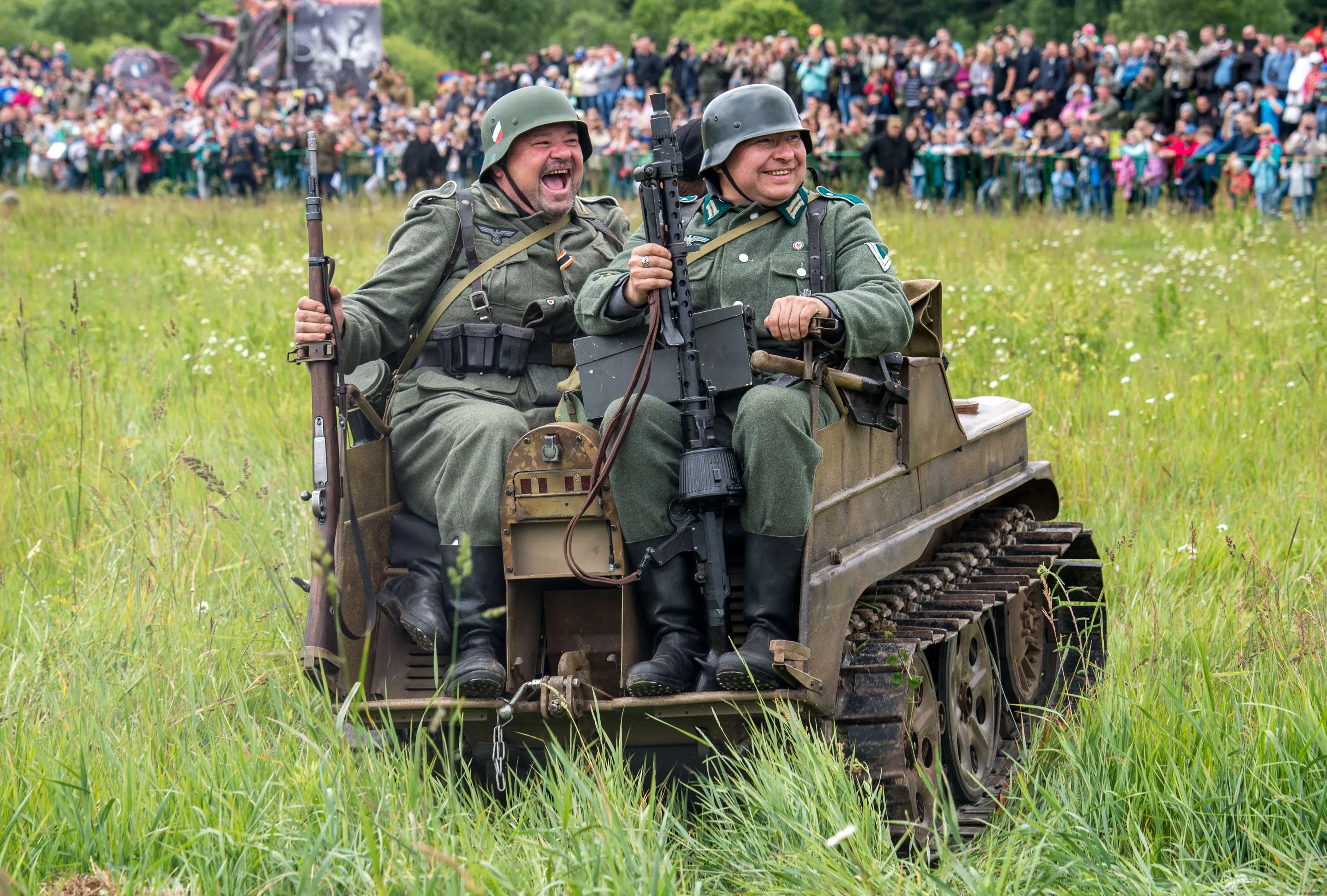Military history enthusiasts dressed as Nazi Germany's troops take part in a stage battle “Summer 1941” near the village of Ivanovskoye, some 60 km outside Moscow, on June 22, 2014, during “War of Motors 2014” festival marking the 73d anniversary of the Nazi Germany invasion of the Soviet Union. (Photo by Dmitry Serebryakov/AFP Photo)
