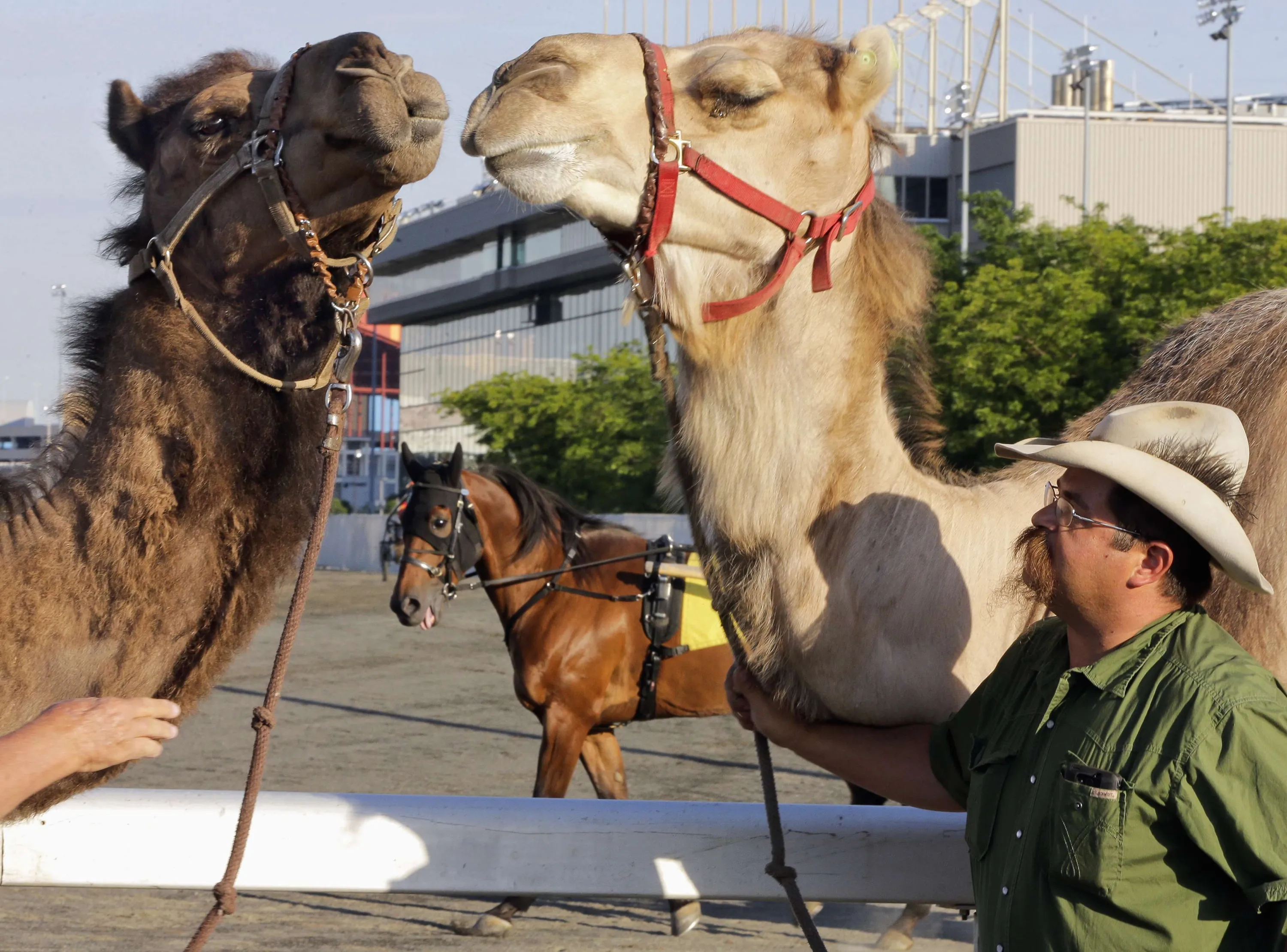 A race horse (C) looks at two camels being exercised by handler Monte McClurg (R), before an exhibition race billed as “The Cameltonian” at the Meadowlands Race Track in East Rutherford, New Jersey, June 21, 2014. Run by Hedrick's Promotions in Nickerson, Kansas, this is the third year the race has been run at the track, in tandem with an ostrich race. (Photo by Ray Stubblebine/Reuters)