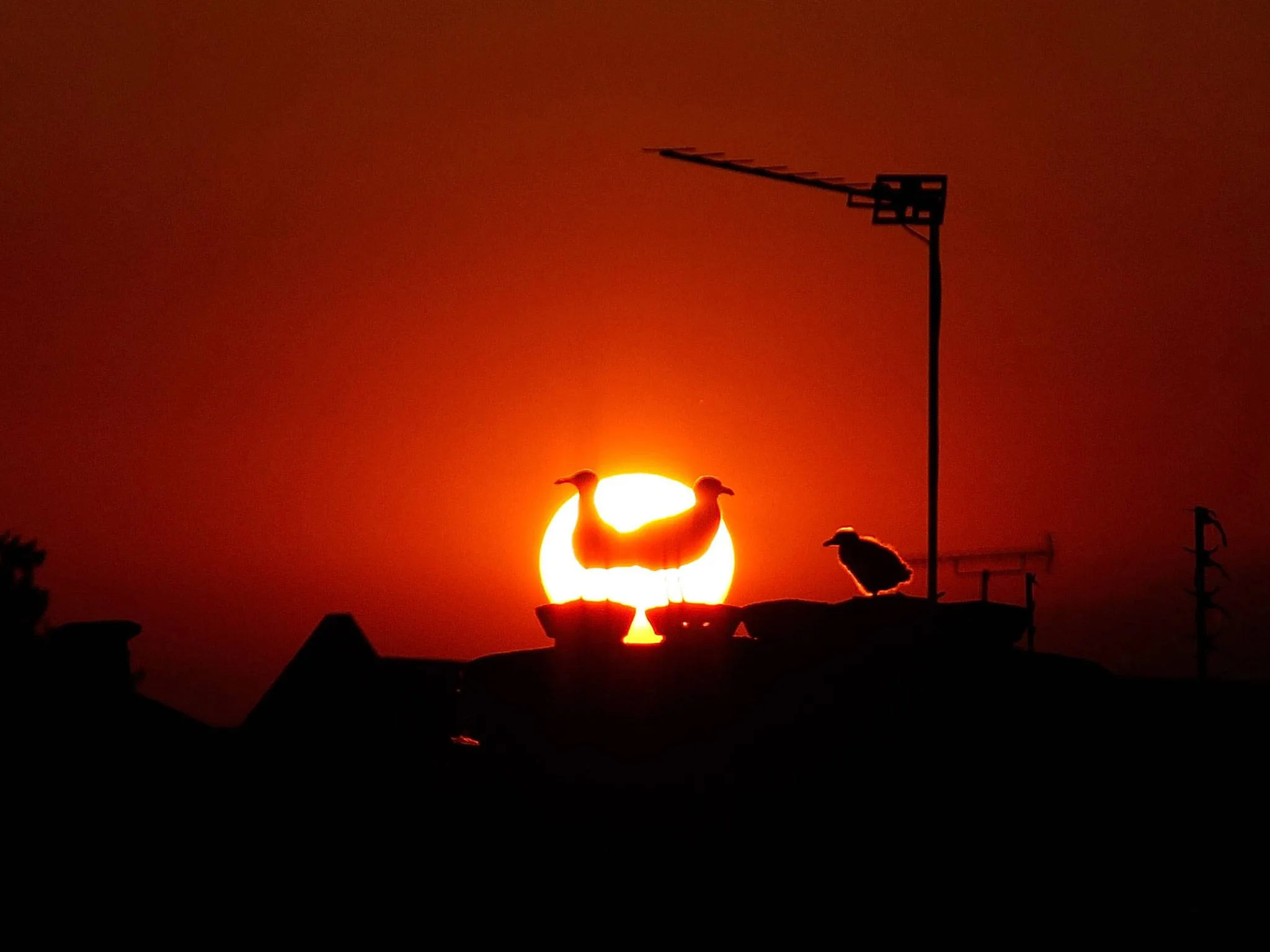 A family of seagulls are silhouetted on the rooftops of Peckham as the sun goes down on June 21, 2014 in London, England. The UK is enjoying a hot start to the summer and forecasters have predicted that the first week of Wimbledon will be dry and fine. (Photo by Mary Turner/Getty Images)