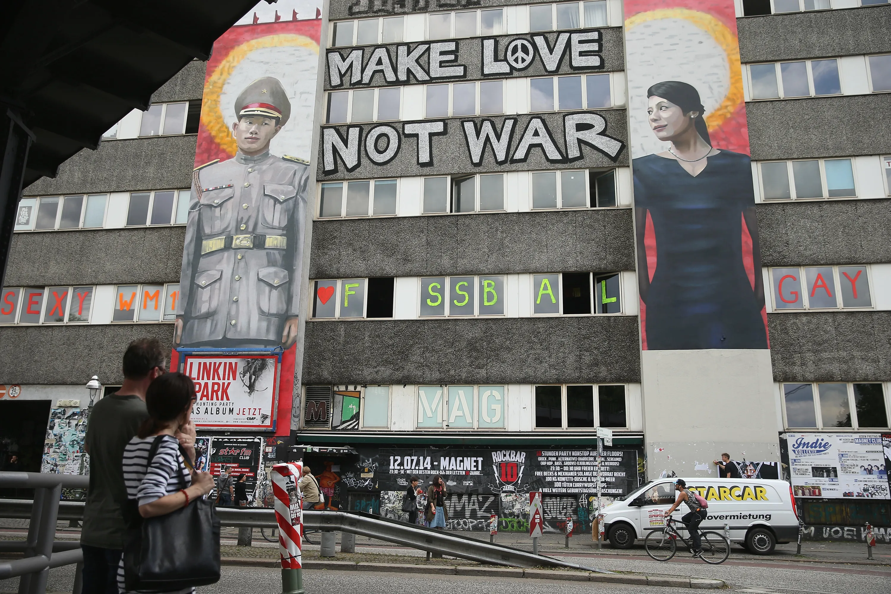 A couple stop to look at two murals of street art in Kreuzberg district on June 26, 2014 in Berlin, Germany. Berlin, with its long tradition of counter-culture, has become a mecca for street art of all dimensions and messages. (Photo by Sean Gallup/Getty Images)