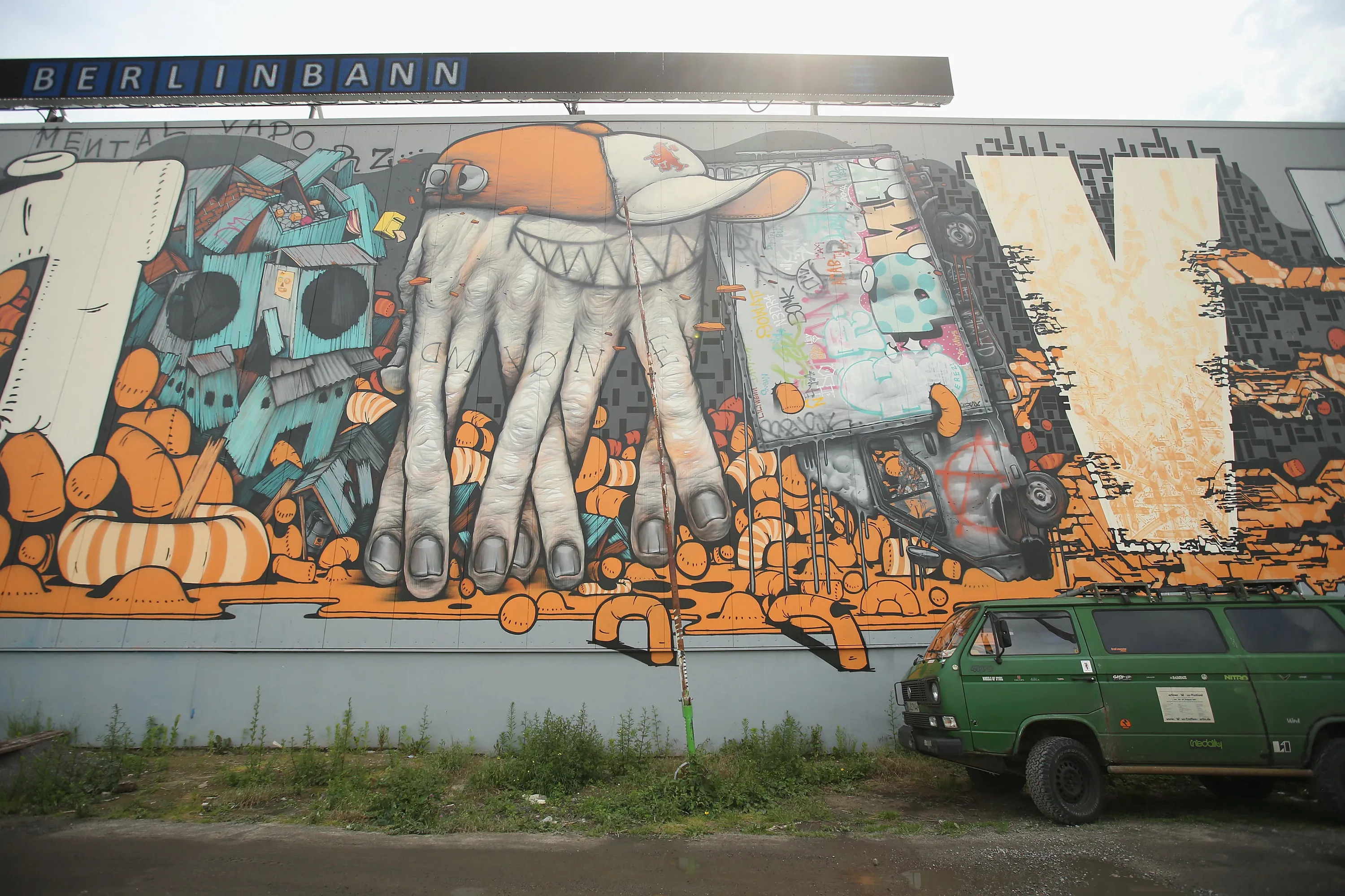 A street art mural by Da Mental Vaporz, or DMV, is visible in Friedrichshain district on June 26, 2014 in Berlin, Germany. Berlin, with its long tradition of counter-culture, has become a mecca for street art of all dimensions and messages. (Photo by Sean Gallup/Getty Images)