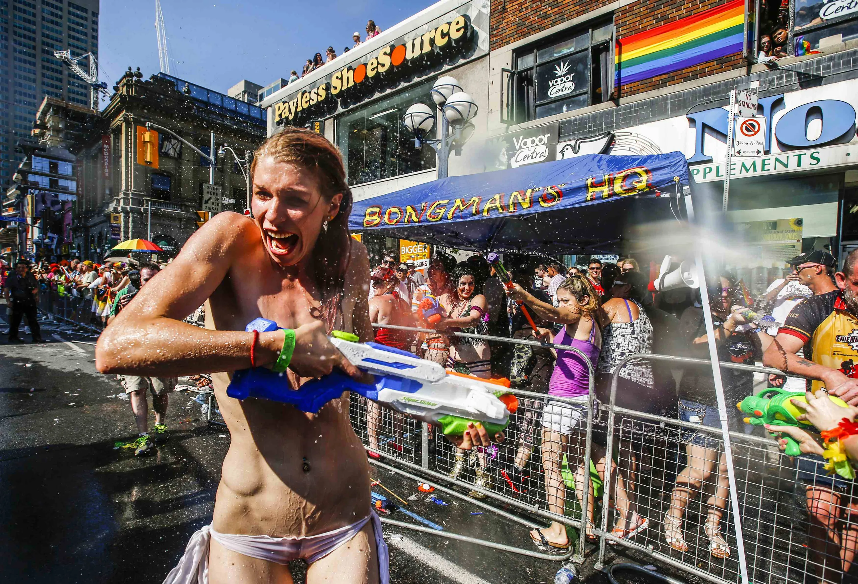 A topless woman gets sprayed by water guns during the “WorldPride” gay pride Parade in Toronto June 29, 2014. Toronto is hosting WorldPride, a week-long event that celebrates the lesbian, gay, bisexual and transgender (LGBT) community. (Photo by Mark Blinch/Reuters)