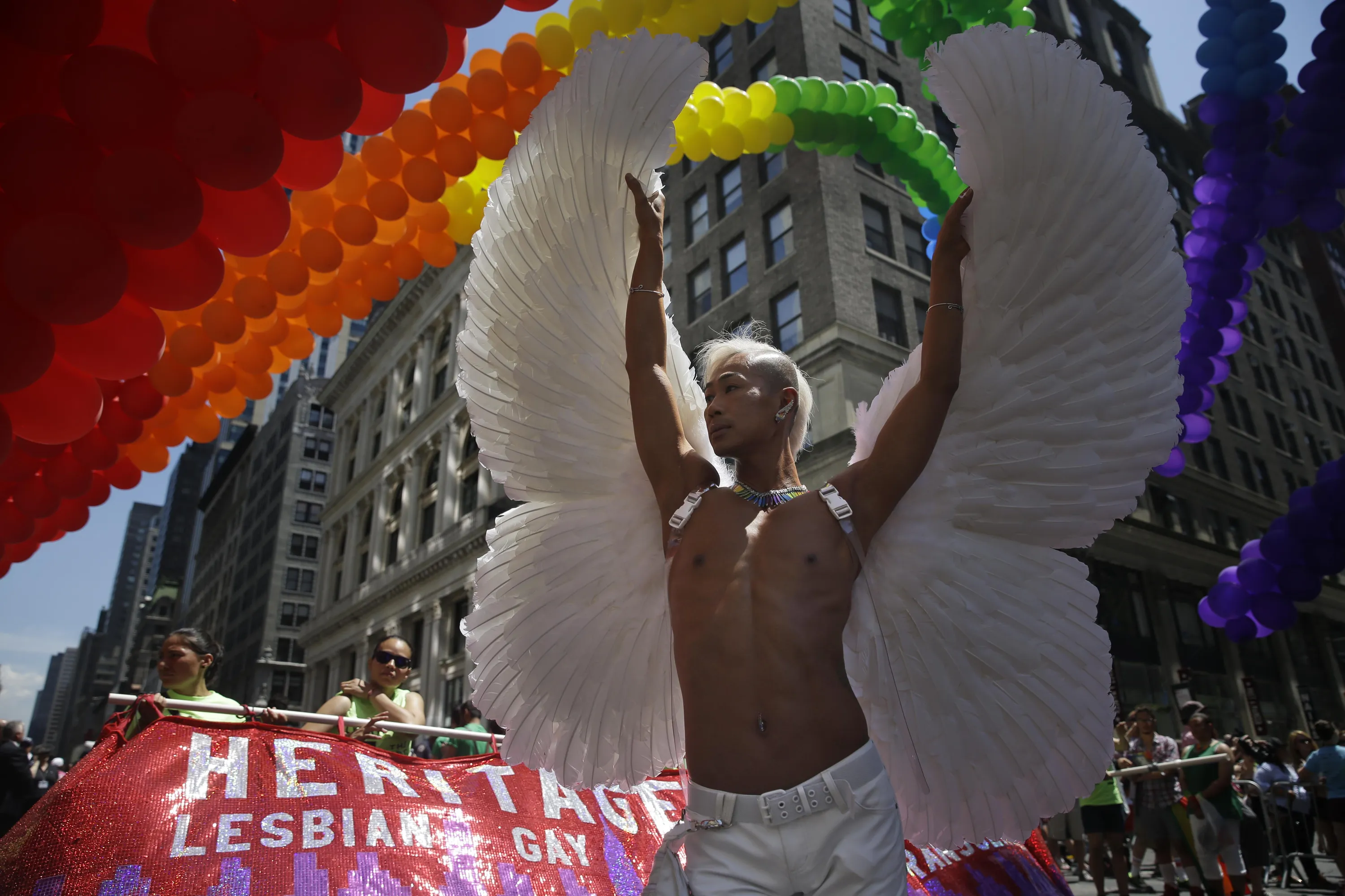 Kent Chua poses for pictures at the start of the Gay Pride Parade in New York, Sunday, June 29, 2014. Fifth Avenue became one big rainbow on Sunday, as thousands of participants waving multicolored flags made their way down the street for New York City's annual Gay Pride march. (Photo by Seth Wenig/AP Photo)